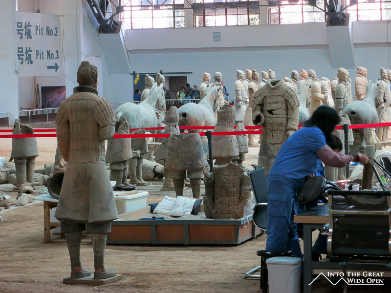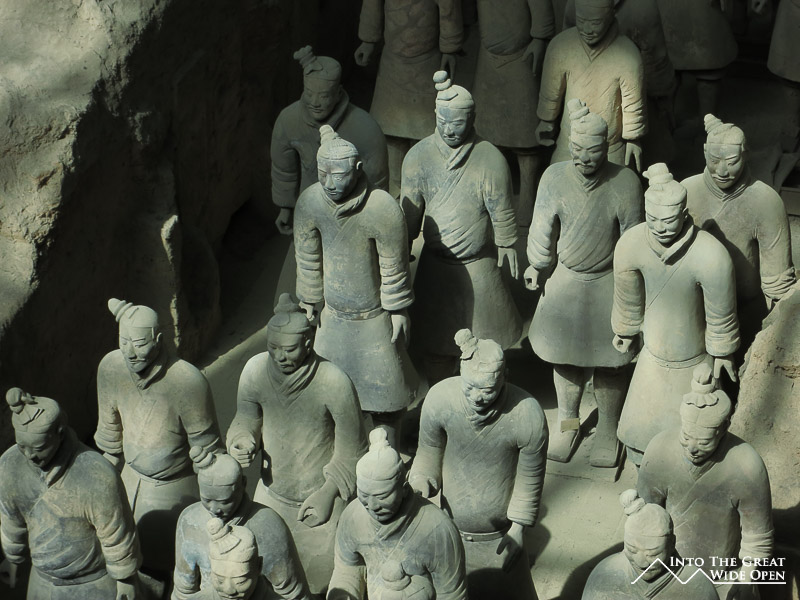 The main attraction, the army of the terracotta warriors is one of the more touristy places I have been, even by Chinese standards. To reach the museum you are forced to walk through a labyrinth of tacky souvenir stores and overpriced restaurants all offering nearly the same things. The huge numbers of tour groups and independent tourists make navigating this a mess as people are inexplicably distracted by the bright and shiny objects and can’t resist stopping abruptly to look without notice. Once you are finally inside the complex there are three pits of archeological finds with only the first pit having been excavated and restored to any semblance of its past glory. Towards the back of the first pit there are people actually working on restoring and rebuilding more soldiers, making for quite the real life jigsaw puzzle. The site must have been a spectacular vision in its time with several thousand figures accurately sculpted and ordered according to rank, just as they would have been in a real army. In their time the figures were painted in colorful pigments only adding to the glory. Pits 2 and 3 show only partially excavated areas with jumbles of broken terracotta fragments scattered about, the result of years of weathering and exposure to the forces of nature. There is also a small museum with a few interesting pieces like two bronze chariots that were unearthed from the ruins.