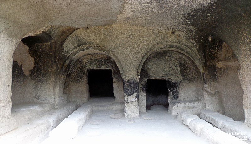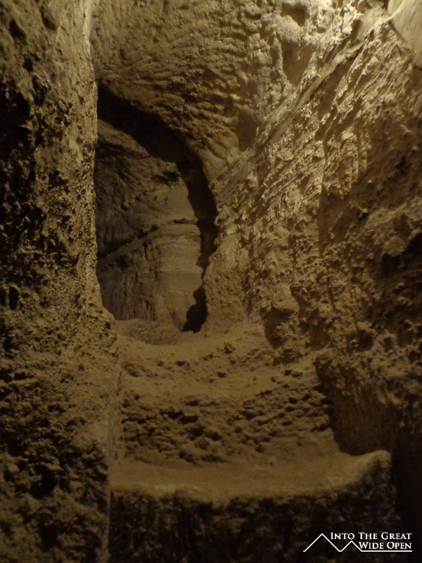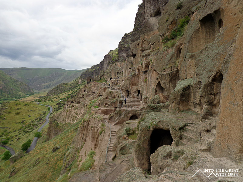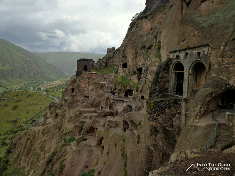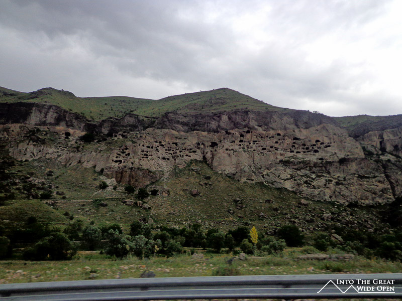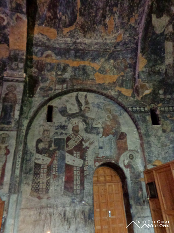 Two hours away in relative seclusion there is the cave city of Vardzia. This intricate complex of over one hundred caves is carved into the stone mountainside in the southwestern wilderness of Georgia. The caves span multiple levels on the mountainside and in the heart of the complex is the Church of the Dormition. The church features a beautiful array of faded paintings covering the entire interior. From behind the church long and narrow tunnels burrow through the mountain to reach the different levels of caves. Walking through these dark tunnels is very disorienting; finally you see a small light that eventually leads to a cave at the forefront of the mountainside, somewhere far above or below the church. While most of the caves are bare, some showcase carved arches and even rows of shelves like an organizational system. Perhaps the best aspect of these caves is that they seemed to be functional; on a warm rainy day, I stayed cool and dry, at least when I was inside the caves. Sadly the same can’t always be said for some of the more modern hotels I’ve stayed in on this trip; progress is relative after all.
