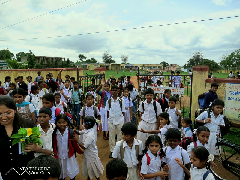 After some introductions with the school administrators the AV equipment was setup and we were seated at a table while the children were told to line up based on their academic year. Following a brief speech in Kannada, the local language, we began distributing notebooks to the children. In fact, we were only distributing notebooks to select children. According to the event organizers, children in the lowest castes are provided notebooks by the Indian government. Therefore, this notebook drive was targeting the children from castes just above that level who did not qualify for the government support. Depending on their year in school the children each received different numbers of notebooks. When they received their notebooks they were very happy to shake my hand.
