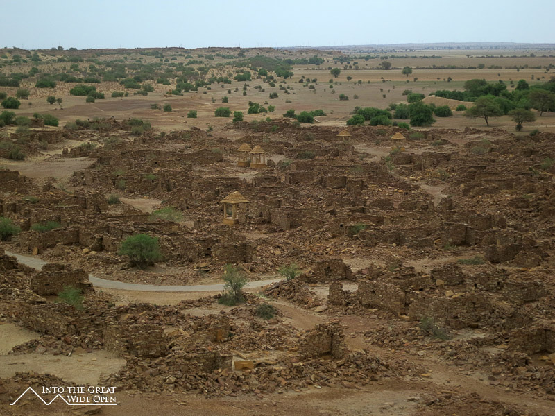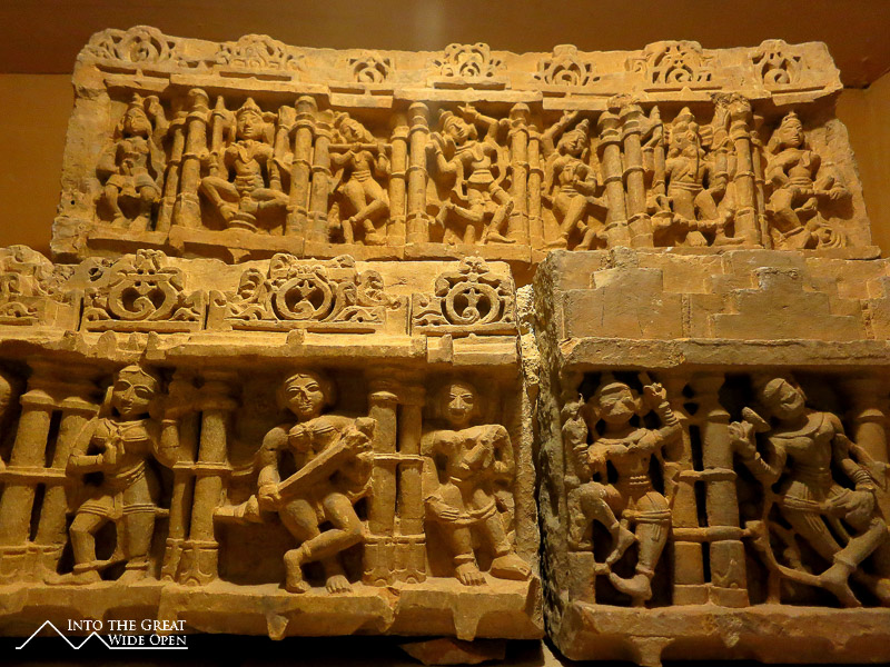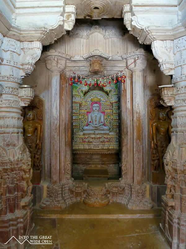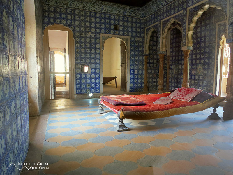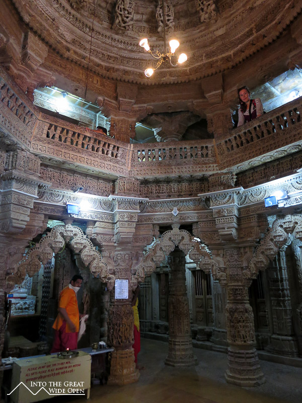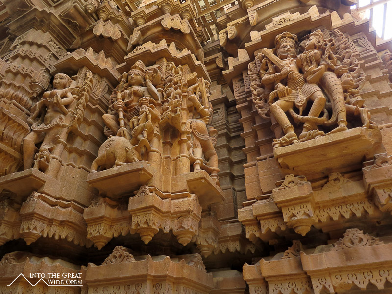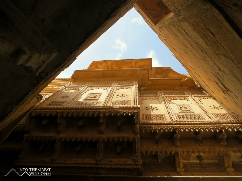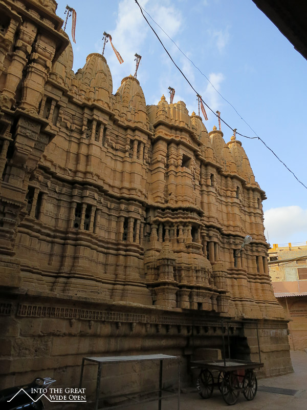As the bus rumbled westward from Jodhpur I could see the landscape desiccate and transform into a stony desert. Jaisalmer is much smaller than Jodhpur but is similarly dominated by a large hilltop fortress that presides over the city. Here the old city surrounding the fort is characterized by old and new havelis, elaborate houses with facades of intricate carvings. Inside the fort enclosure there are a Palace Museum and Jain Temples. The Palace Museum has rooms and courtyards similar to the fort in Jodhpur. The Jain Temples feature very impressive carvings over nearly every surface on the interior and exterior.