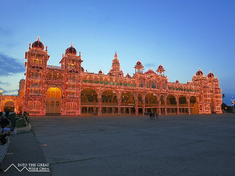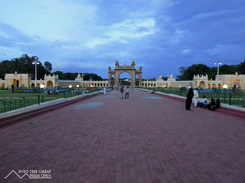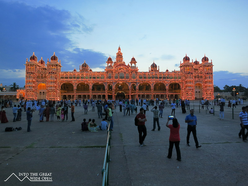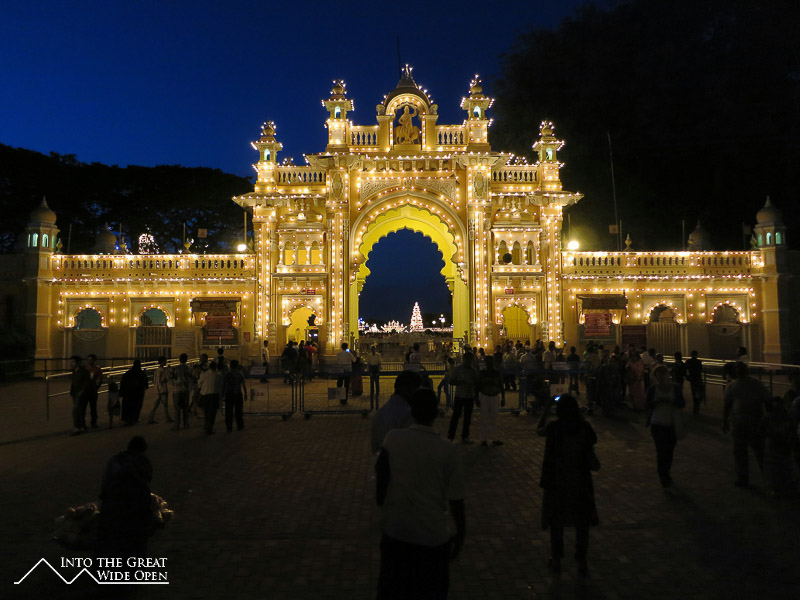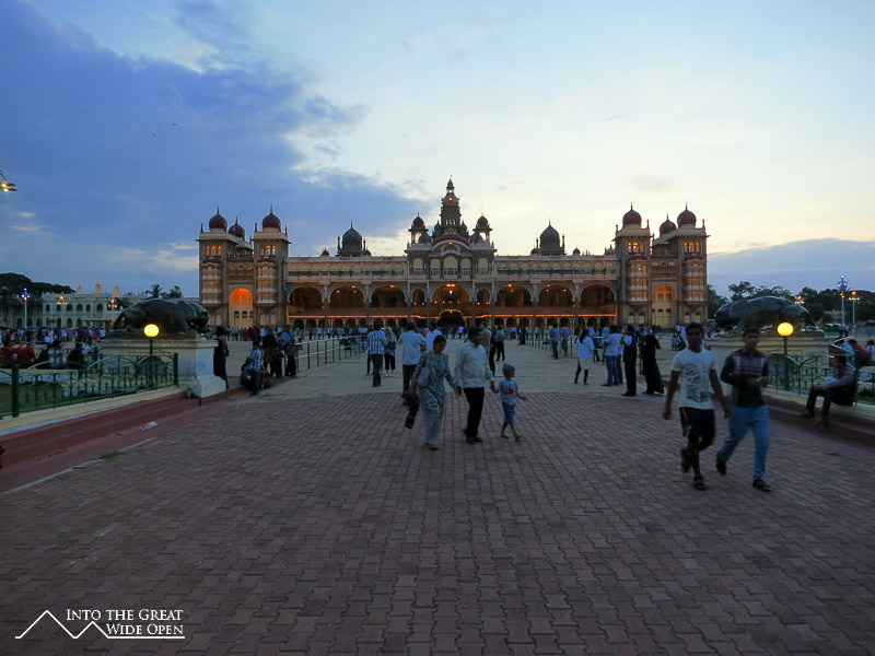 At exactly 7pm the thousands of light bulbs adorning the Mysore Palace are illuminated and you can actually hear the sounds of the bulbs popping into action. The sound is so loud that it startles the birds that have come to rest on the palace. The lighting of the palace is only done on Sundays and public holidays so the grounds were crowded with families and tourists eager to see the show. Along with the lights there was low volume music being played by something resembling an orchestra at the base of the palace. As darkness fell, the 98,260 light bulbs shimmered in the twilight drawing the focus of everyone’s camera or cell phone.