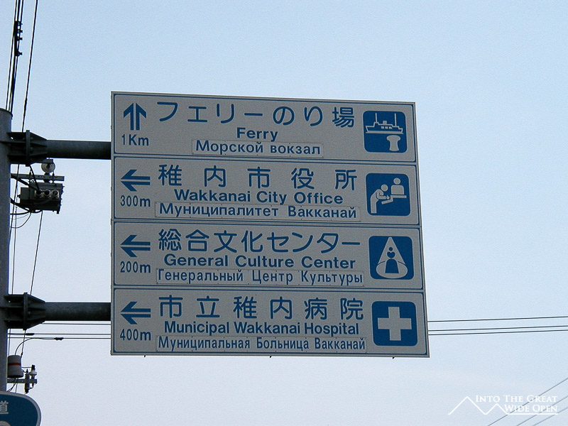 Wakkanai street sign in Japanese, English, and Russian