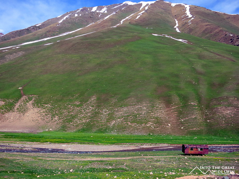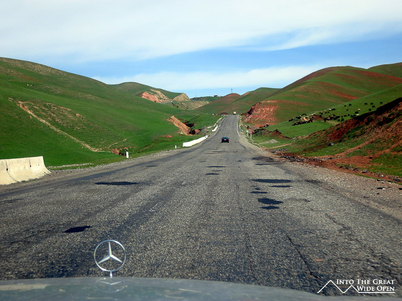 The road from Osh, the second largest city, to Bishkek passes by the third largest city, Jalalabad. In between are miles of empty countryside where animals probably outnumber people. The road winds through green rolling pastures and eventually crests the top of a rise with views of Totogul Reservoir, created after the construction of a dam to harness hydroelectric power. The road wraps all the way around the reservoir before the ascent to the Ala-Bell pass, at this time of the year still covered in snow at 3175 meters elevation. On the other side of the pass a large valley opens up and the old Mercedes with a cracked windshield with 370,000 kilometers that I was riding in flew across the straight roads at 80 miles per hour. Ahead you could see a looming mountain and nowhere for the road to go but up. Looking at the slope of the mountain, sections of the road appeared in a confusing jumble, seemingly everywhere as the array of switchbacks inched slowly upward. Near the top a long tunnel bores through the mountain and another cascade of switchbacks brings you back down for the final stretch to Bishkek. This section is one of the more spectacular roads I have been on; from the top there are sweeping views of the valley floor and the steep curvy road.