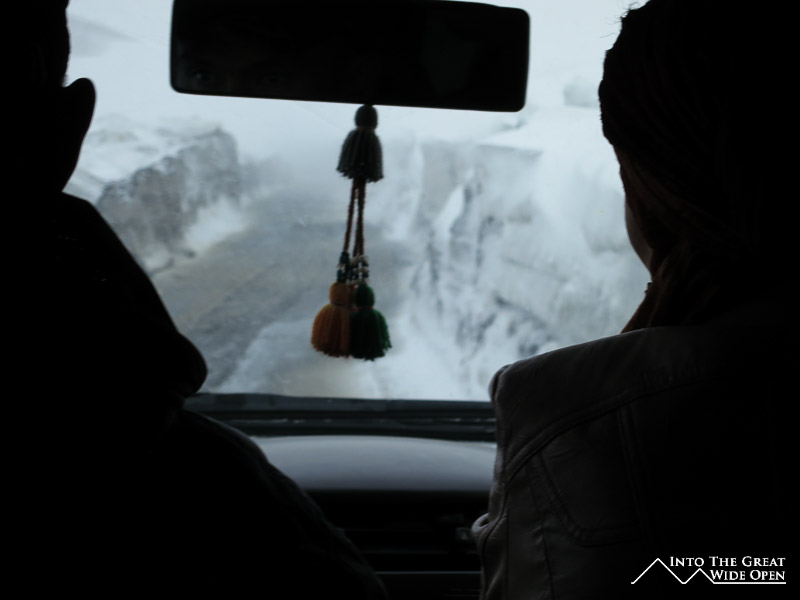 Around this point the road conditions also began to get dodgy. The snow piled on the side of the road began to encroach closer and closer and at one point the road was down to a single narrow lane with the snow banks cut vertically to make room for one vehicle. Not long after that we reached the top of the mountain pass and the driver decided this would be a good time for a cigarette break. Amidst this driving snowstorm we stopped and took the opportunity to pile out of the car and stretch our legs. The snowstorm, fog, and random crowd made this an ideal time for a bizarre photo opportunity.