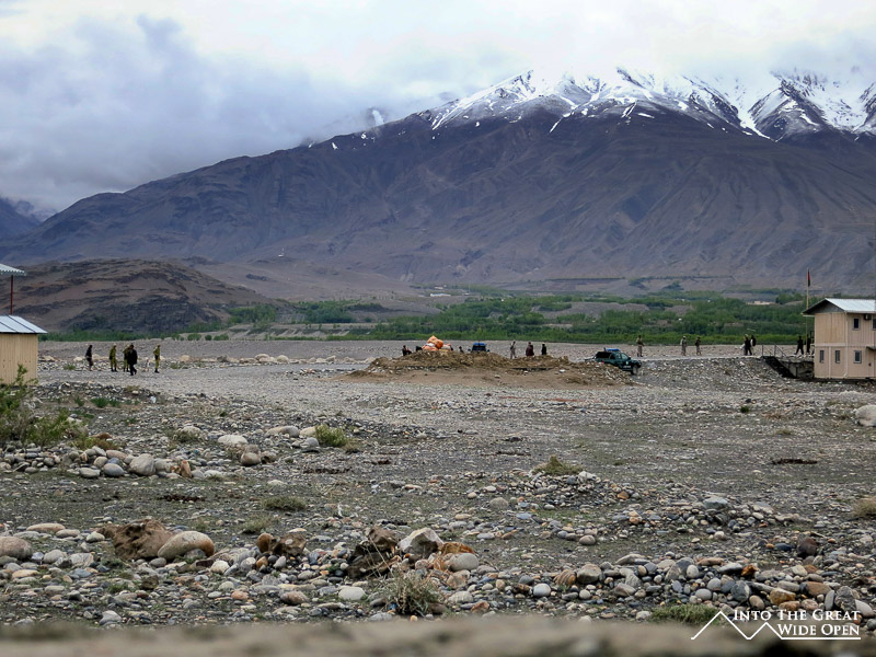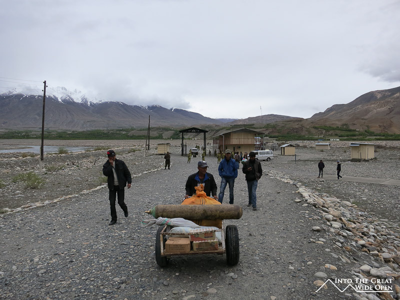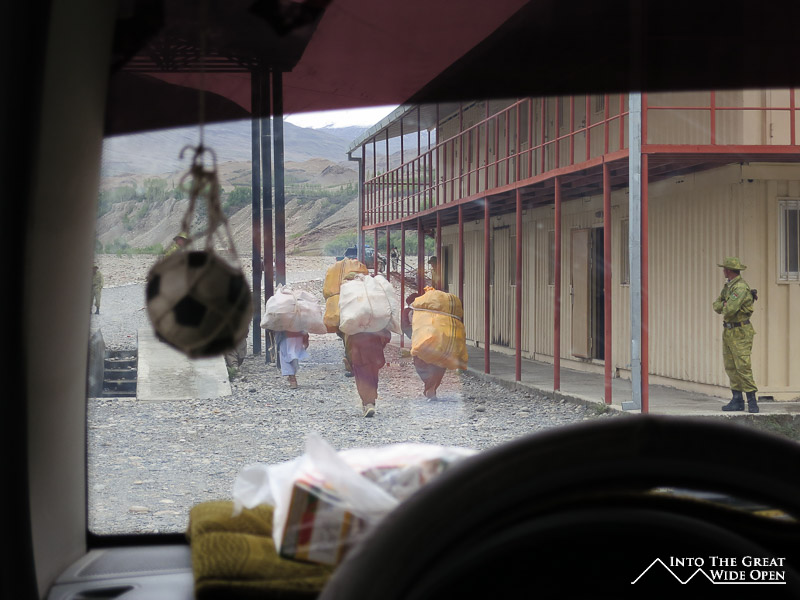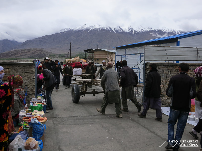 From the Afghan side you see merchants dressed in traditional robes carrying huge sacks of goods either on their backs or on makeshift rickshaws made of lumber and old car axles. They file past the Afghan soldiers and Afghan border post to the Tajik soldiers and the Tajik border post before entering the market. Strangely enough, considering the huge problem of drug trafficking, there didn’t seem to be many searches of their bags being conducted, though this would be very impractical anyways with the large volume of goods moving back and forth.