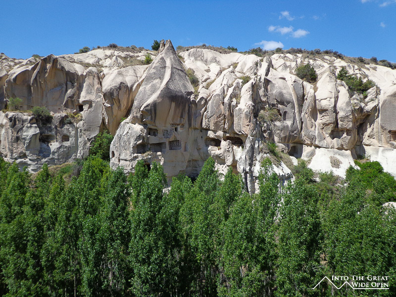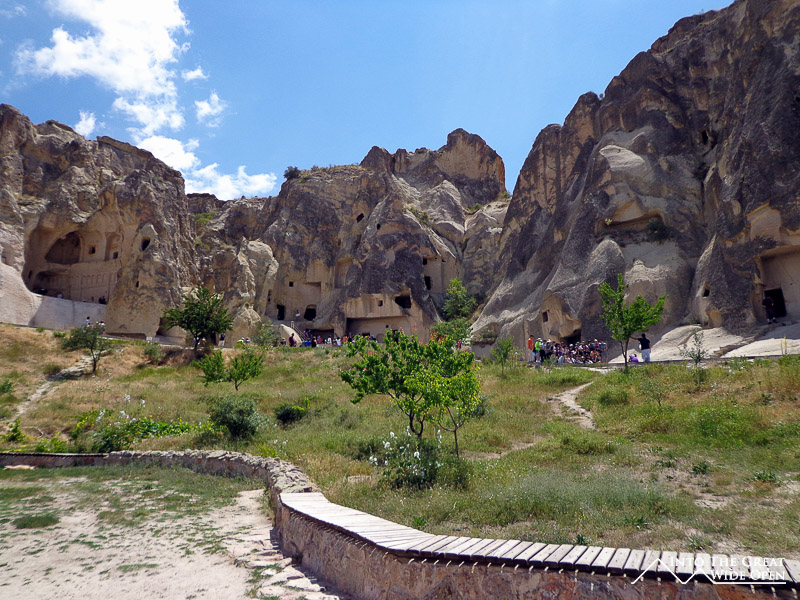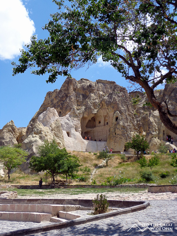 I walk past tourists speaking Italian, Spanish, Portuguese, English, Turkish, Russian, French, German, Korean, Japanese, Chinese, and Hindi, among others I am sure. The town is full of tourists and there is no escaping its touristy feel. The Open Air Museum features rock formations dotted with caves: living quarters, dining rooms, kitchens, and churches. With all the tourists and their tour guides it is hard to move in these small spaces, not designed for modern people of our size or for these group sizes. The caves themselves are not overly interesting and after queuing in line to see many it often doesn’t seem worth the wait when you enter a barren cave. Many of the higher level caves are inaccessible, perhaps due to blocked or unstable passageways. The way the people must have lived is what is interesting but there is little information or recreations to detail daily life in a cave complex such as this one. All that remain are artifacts like carved stone dining tables, rooms with shelves for storage, and kitchens with ovens for cooking.