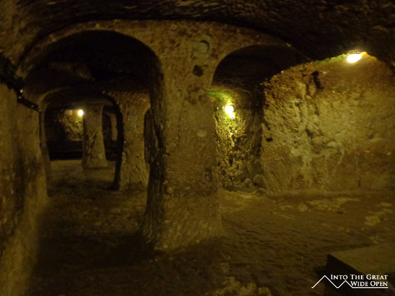 The underground city at Derinkuyu offers a change of pace from the monotony of seeing cave after cave after cave. Here a labyrinth of tunnels and stairways lead deep beneath the earth to a complex of chambers comprising a small city. Bending and stooping to navigate these tiny chambers amidst dim lighting and few signs was an unreal experience. At times it felt like being on the set of an Indiana Jones movie, complete with giant stone doors that could be rolled shut to seal off passageways. Returning to the surface was a welcome experience, except for the glaring sunlight and oppressive heat; perhaps that’s what drove these people underground to begin with.