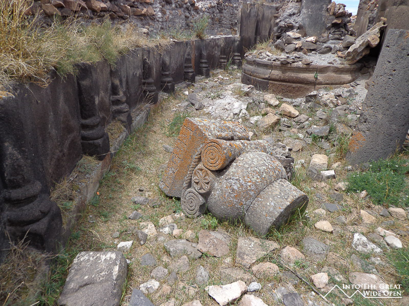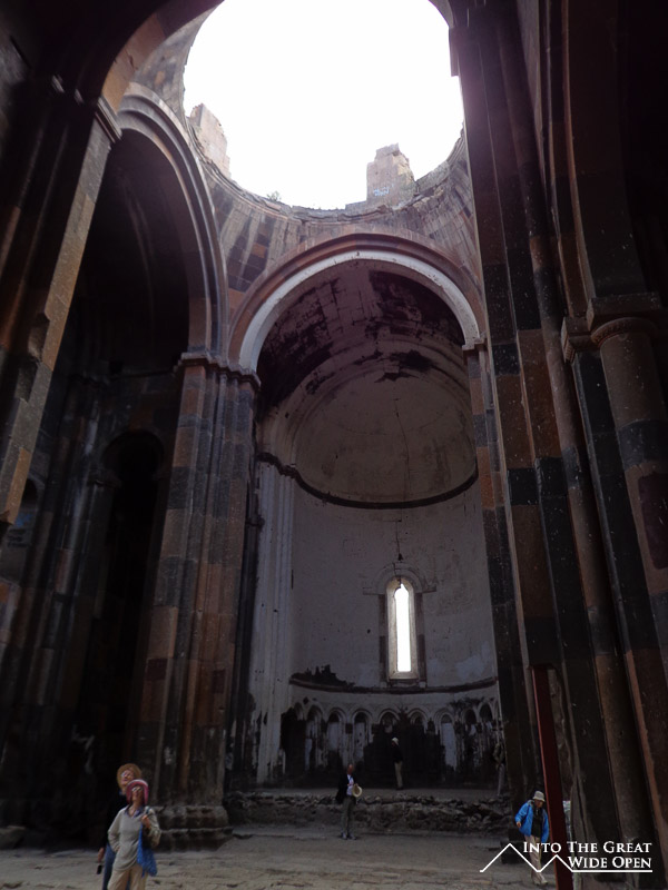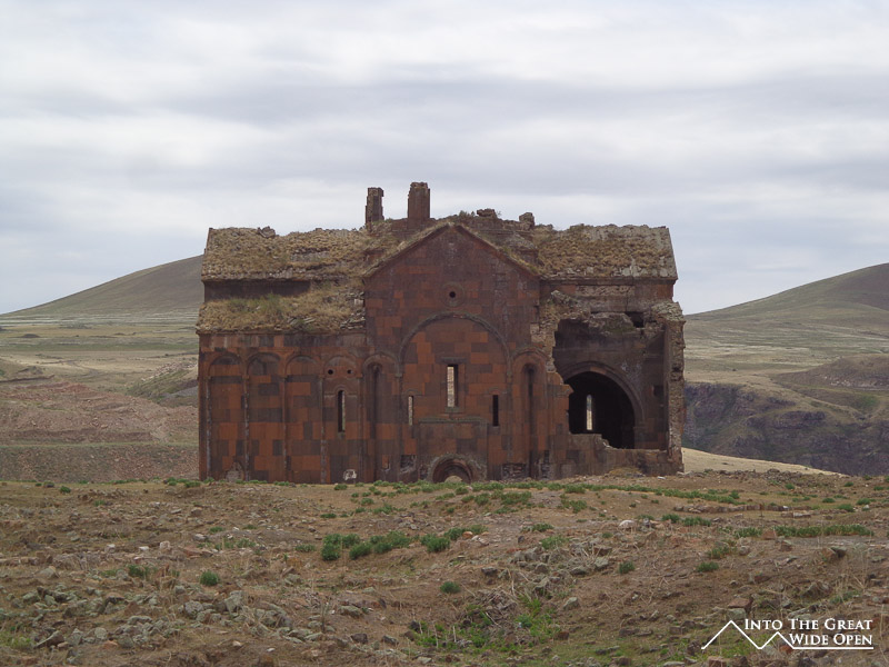 Much of the site itself is un-restored ruins with a few grossly over-restored exceptions. Years of exposure to the elements, both natural and human, have left many of the buildings crumbling to pieces. The best example is the Redeemer’s Church, or exactly the half of it that remains. The weathering of the buildings has produced some amazing effects with grasses and weeds sprouting from the roofs and walls and ceilings caving in to let in the natural sunlight. An interesting thing about the site is the array of buildings, there is a mosque (the first one in Anatolia no less), there is a Georgian Church, there are Armenian Churches, and there is even a Zoroastrian Church. Thankfully there are no decaying Soviet buildings to lend an air of depression to the site. The most appropriate artifact in the site is an ancient bridge across the river, the only possible link across the deep river gorge, which lies in ruins, much like the current relationship between Armenia and Turkey.