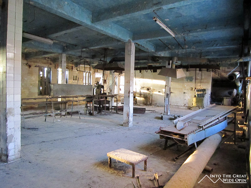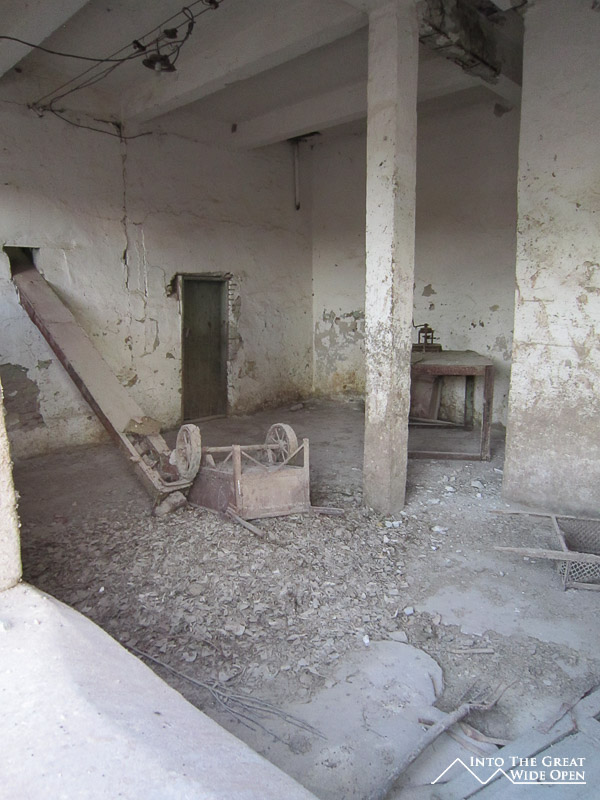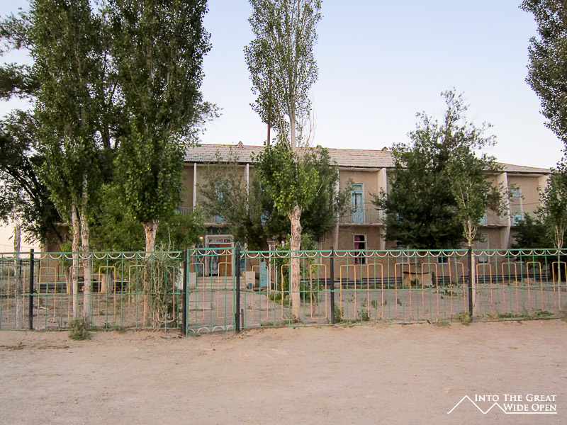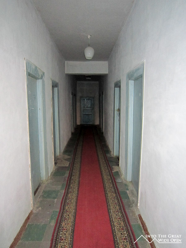 At the end of the road through town there is still one hotel, long since faded from its past glory, which caters to the trickle of tourist traffic to the area. What once must have been a lively seaside hotel features dilapidated rooms and dark corridors with layer upon layer of desert dust. Near the hotel, on sand which was once the sea floor, lie the rusting hulls of the local fishing fleet, permanently grounded when the lake receded. From the bow of the ships the endless views across the newly created desert stretch to the horizon. This wasteland has altered the local climate, resulting in dust storms and longer, harsher seasons. On top of the bluff a monument has been erected which depicts Muynoq and the Aral Sea in 1960 and in 2012. Satellite photos through the years call attention to the extent of the shrinkage of the sea and a paragraph of information about the collapse of the sea provides information on the receding waters but fails to mention even a single reason for the disaster.