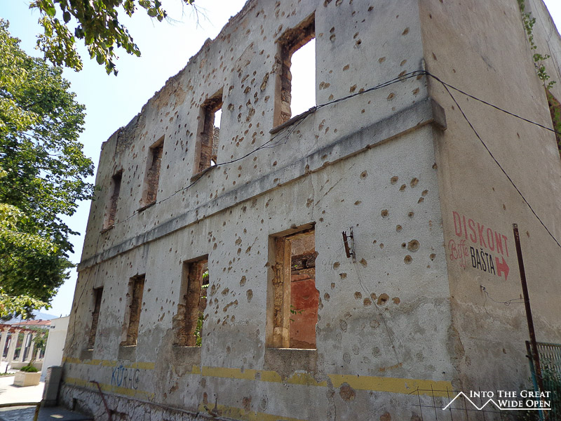 From 1992-1995 the city of Sarajevo and the outlying countryside and cities were war zones. At times Sarajevo was completely surrounded by Serbian forces holding strategic positions in the mountains around the city. Day after day snipers shot at civilians on the streets, forcing people to sprint across exposed intersections and take cover behind cars, steel plate barriers, and anything else they could find. Beginning at 5am mortar fire pounded the city daily, driving people into underground basements and away from windows. The toll this took on the city’s infrastructure was staggering. Today, almost 20 years after the conflict, shattered skeletons of buildings, riddled with hundreds of bullet holes, still stand precariously with trees taking root and growing through the windows that people once gazed out of.