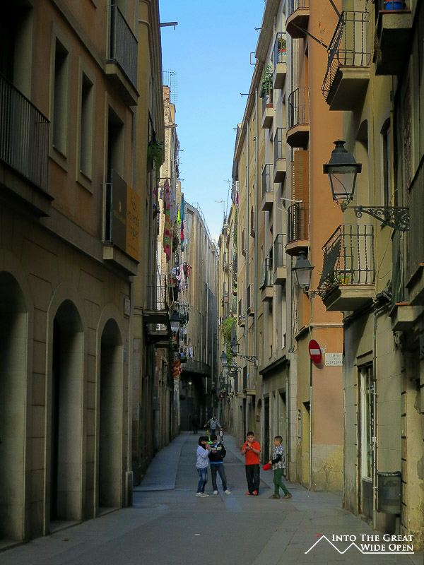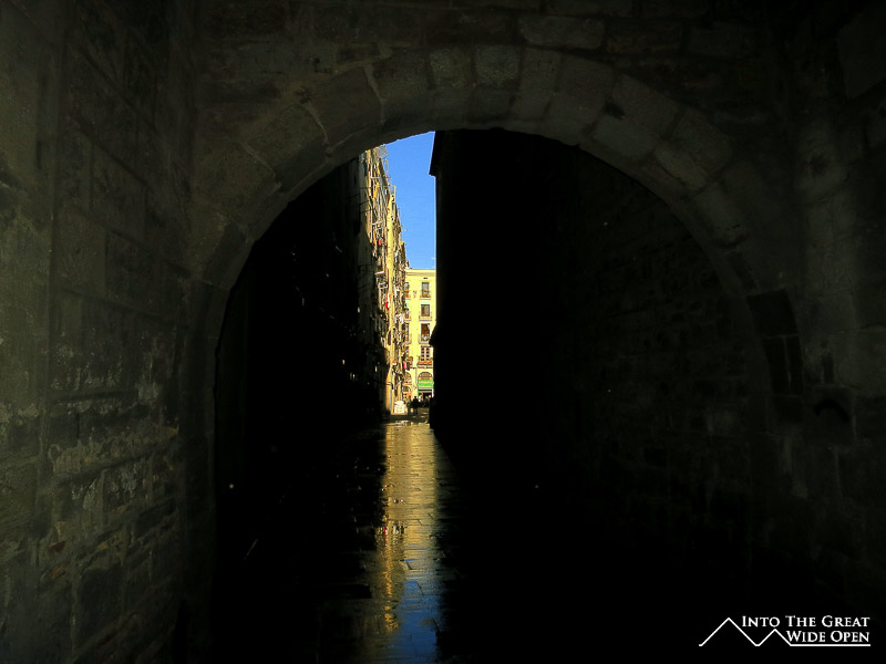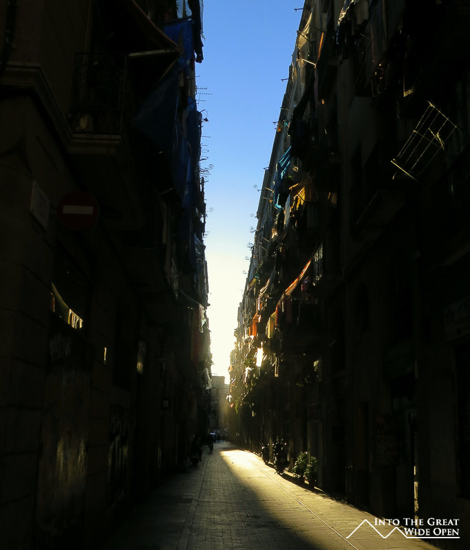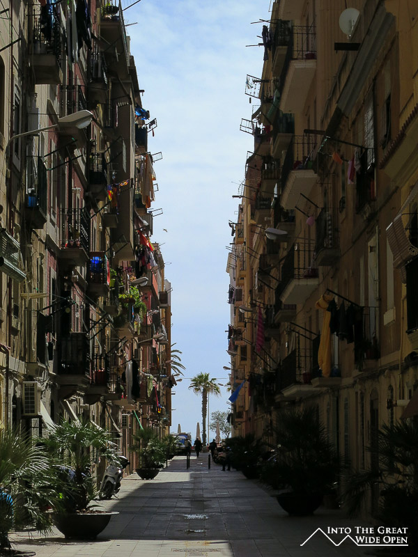 The sun shines through a narrow street in Barceloneta