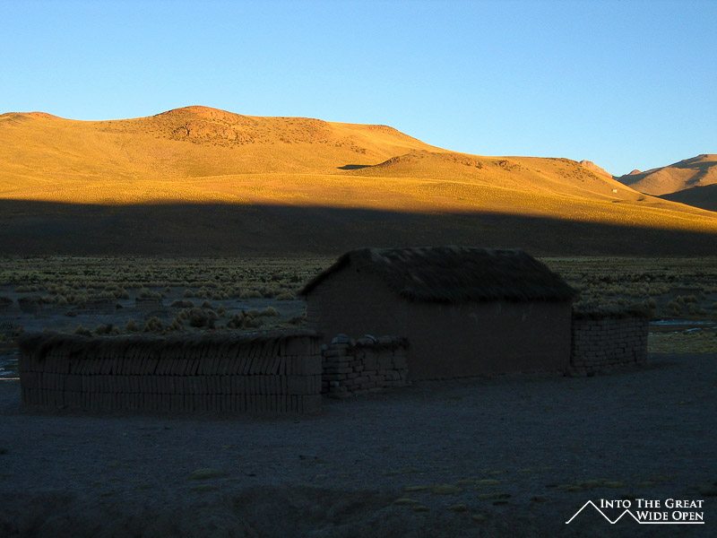 As we began to get higher in elevation we saw lots of ice on the few rivers and in patches on the ground. One of the rivers that we had to cross had ice that was almost an inch thick on it, and the older jeep in front of us had some trouble getting out of the river, probably because the tires were bald. Our vehicle had no problem and after crossing the river it was another hour or so drive to the little village at almost 4,300m where we spent the first night. The village had about 200 people and the people did some small scale gold mining and tended llamas. At night, the temperatures drop down to around -20C or -4F so it was very cold.