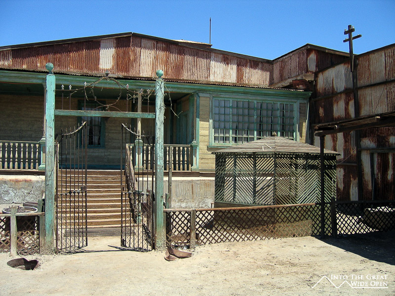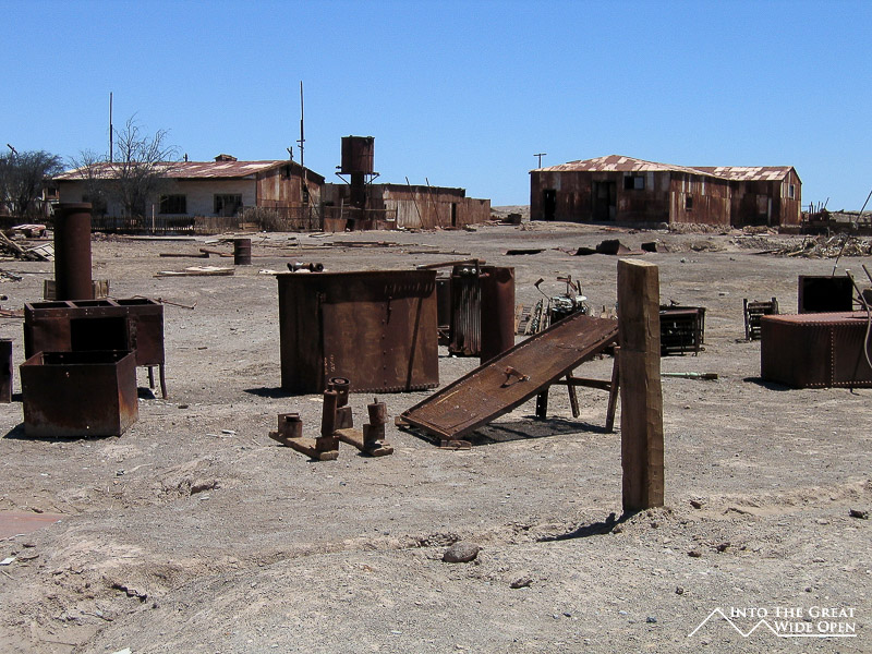 From Santa Laura I walked about a mile through the desert under the roasting sun to Humberstone. Humberstone was suprisingly large and almost all of it, save for a few buildings that had been restored, were in the original state. In the main plaza there is a building with all of the interesting bottles, cans, books, and other everyday items that had been found, some preserved amazingly well. Other than those, all the buildings were completely empty, long since stripped clean of anything of value or use. The town had been rather prosperous with a large theater for movies and plays and a swimming pool made from the bolted together metal segments of ship hulls; it even was complete with a diving platform, although I’m not sure where the water would have come from. Behind the town, further off the main road, are the mining buildings with all the old mining equipment. I was the only person of the few people visiting Humberstone to actually venture back there and it was eerie to walk through such a large deserted complex alone.
