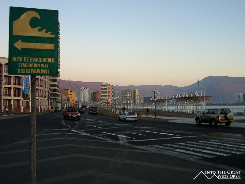 The city itself is actually surprisingly interesting. With nitrate mining back in the early 1900s the city became very prosperous and there are still many old colorful mansions in various states of preservation or disrepair that were originally inhabited by the mining barons. The mansions have wooden clapboard siding and corrugated metal roofs that in many cases have been left intact and are corroded from the salt spray of the Pacific Ocean. While nitrate mining disappeared around 1960 with the discovery of a synthetic production method, Iquique still serves as an important port city and has a gigantic duty free shopping center with every kind of electronics good, alcohol, perfume, or clothes that you could want at fairly good prices. That is the interesting part of Iquique, the rest of the city is basically a modern and expensive beach resort with high-rise condos and hotels, essentially it could be anywhere in California if not for the unique and spectacular setting. With the mountains surrounding the city, there are numerous signs for tsunami evacuation routes because if there ever were a tsunami it would entirely destroy the city because the waves would wash inland, deflect off the tall sand dune, flood the city, and drag it out to sea.
