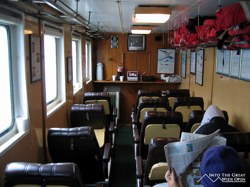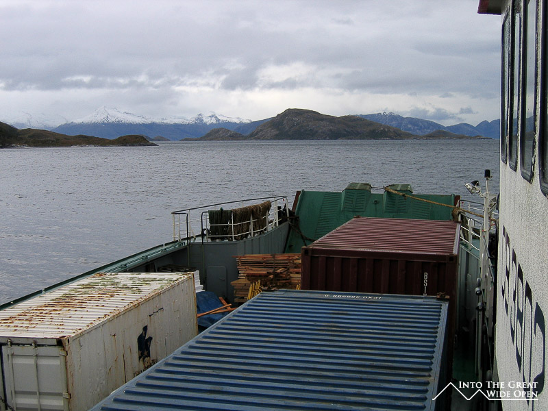 When I arrived to see the ferry for the first time, I was rather surprised at how small it seemed and by the fact that there seemed to be almost no inside area to sit in. I quickly found out that this was essentially true, to which the photos attest. The inside area where I was to spend almost all of the next 35 hours was something of a cross between an old bus and that of a cheap dive bar, only without any alcohol. It was not terribly appealing by any means and sharing it with another 13 people didn´t make it any better. The food was actually surprisingly edible, at least compared to that on the Navimag ferry from Puerto Montt to Puerto Natales, especially the one dessert we got. The scenery was very similar with lots of uninhabited islands and not much else.