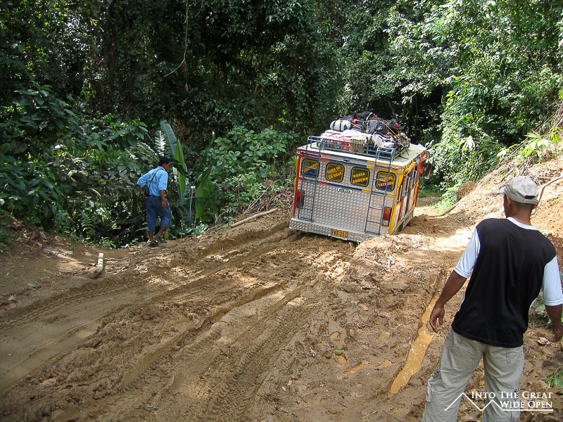 In order to even reach the beginning of the trail we needed to take a 3-4 hour jeep ride from Santa Marta to the trailhead. The chiva or jeep that the tour operator provided was an old Toyota Landcruiser which was colorfully painted and looked more than rugged enough for any purpose. Eight of us, plus the two guides and a driver, piled into this outlandish vehicle with all of our belongings and other provisions lashed to the top. The other four went in another vehicle as there wasn't enough room in the jeep for everyone. The first part of the ride was slow as the loaded jeep couldn't manage more than 40 mph, so it took us over an hour to get to the turn-off from the paved road to the dirt road that led inland to the jungle. Once we reached this point, the road began to slowly deteriorate until we needed every bit of four-wheel drive power that the jeep could muster and unfortunately, this wasn't always enough. I was sitting on the edge of one of the rows with a little door comprised of bars and a small ledge that went up to my hip, with the whole upper part open up to the support beams for the roof so I had quite a good view of the road we were going over and of what lay beyond the side of the road.