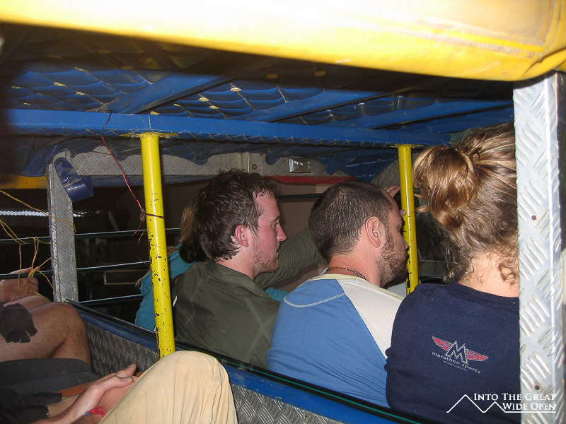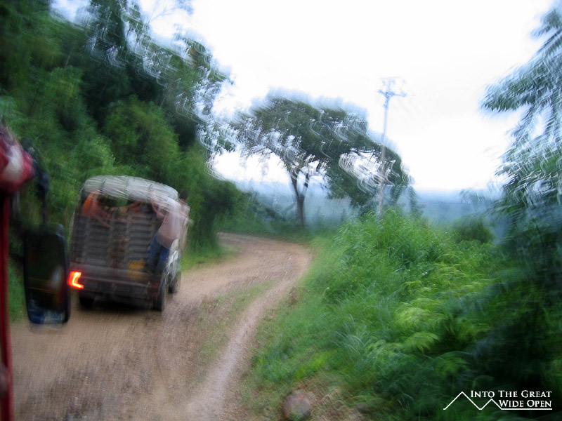 We loaded everything onto the roof of the jeep and we piled in, this time there were 15 of us, with 13 inside the jeep and two of the guides riding on the roof. The overloaded jeep had some trouble with some of the sections and pitched from side to side even more, forcing all of us to dismount as it navigated some muddy stretches. At this point we were all wearing sandals and were not exactly prepared to slog through the mud. When we had to get out, the jeep would plow ahead and we would all have to run behind it in the mud with our sandals to catch up because the driver and the guides really wanted to get off the bad sections of road before it got dark. With all the extra weight the jeep was riding considerably lower to the ground and a few times tree branches and rocks hit the gas tank. One of the guides got out to check the tank several times and because he spoke the fastest Spanish that I've ever heard none of us could understand if the gas tank was leaking or not, however it certainly smelled like it was.