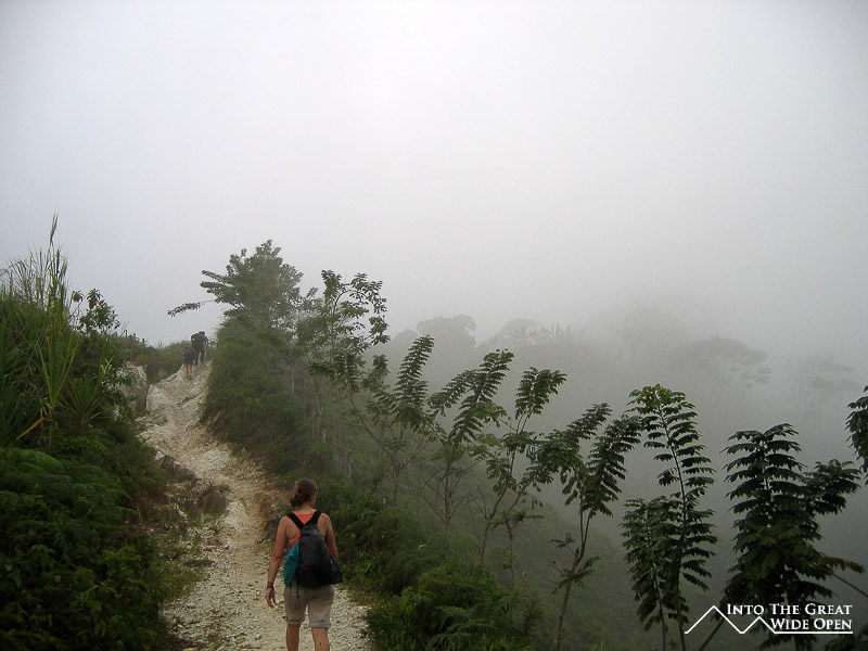When we reached the first uphill stretch, it was rather steep and quite rocky but not terrible. Then it started to rain. This was probably why they had given us garbage bags before we started hiking. As the rain worsened we all donned plastic bags over our backpacks and continued hiking uphill. Then it started to absolutely pour rain and we continued to slog uphill past a military checkpoint and a little store in a shack selling drinks and snacks. After leveling out for a while the trail turned sharply downhill and at this point it was not so much a trail as a deep muddy chasm carved into the ground with a river of muddy water from the unrelenting rain running down the middle and off to the sides at every angle.