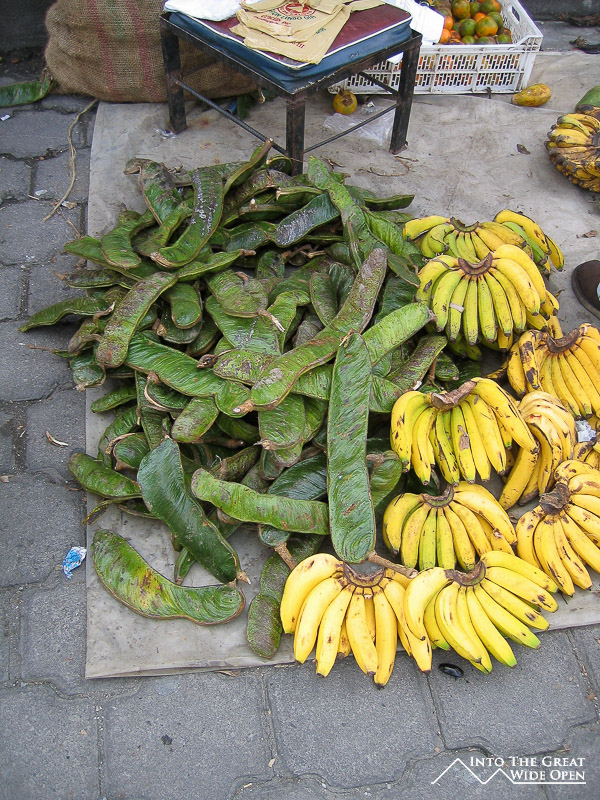 The produce market was a entirely different. There were stalls with all sorts of fruits and vegetables along the one entranceway to the market, including a few strange fruits like the long thin green fruit, that I had never seen before. I asked the vendor how you eat the fruit, and so he got out his knife and showed me, to some laughter from the few locals standing around. You have to split the fruit open on the narrow side and then there are these series of fleshy white pods that surround a black pit, a pretty mild tasting fruit, but quite good, and the unopened fruit can double as a weapon too. Upon further research, this fruit appears to be called guaba and is entirely different from the similarly sounding guava (in English).