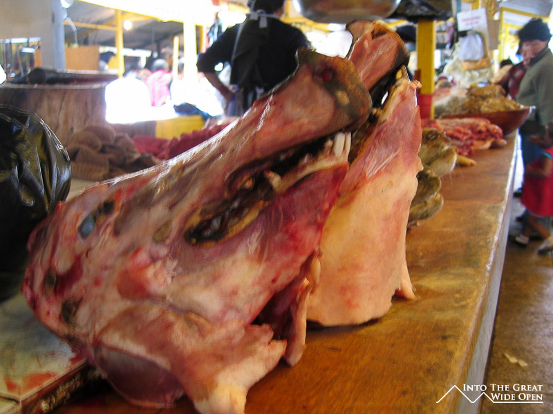 The most impressive feature of the market was the meat section; impressive and nauseating. There were tables with freshly decapitated goat heads, skinned pig heads, and many large bins of an assortment of organs: intestines, livers, stomach linings, kidneys; you name it and it was there. Unfortunately I wasn´t able to a picture of the big bucket of cow hearts, because they whisked them away when I took out my camera and said that I needed to buy them if I wanted to take a picture. I really didn´t know what to do with $5 worth of cow hearts so I was forced to pass on this offer. There were also these big bowls of jellied fat as well as loosely folded up bundles of animal skin, with the fatty tissue side up. The worst part was probably the cumulative smell, a mixture of wet dead animals, meat, organs, and fat, all of which had come to rest at room temperature with persistent flies in the air. Not an environment for vegetarians or the faint of heart.