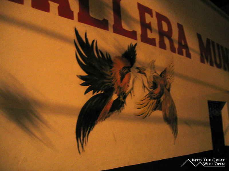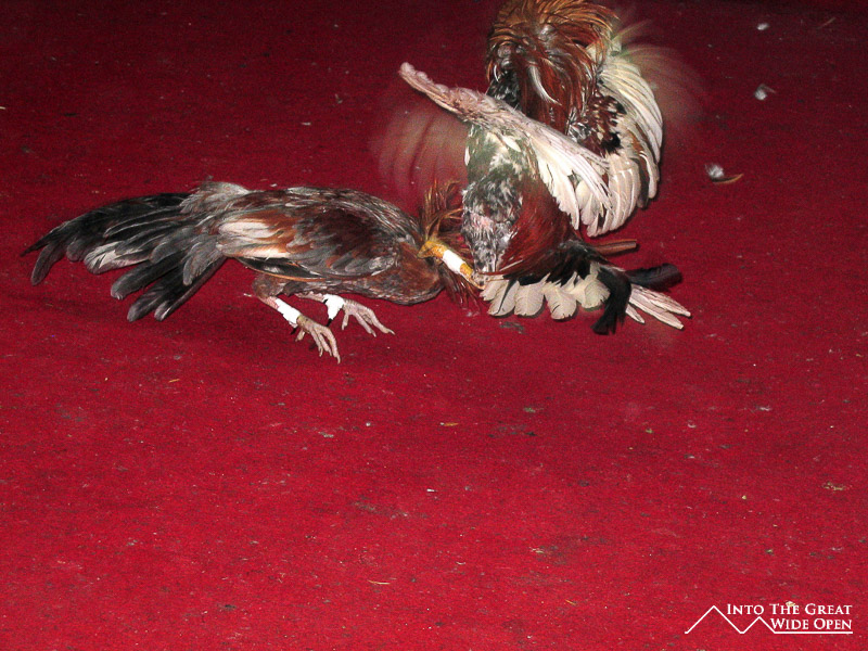 The fight began in rapid succession with a quick charge and some pecking to the head and neck. The action was really fast and it was hard to determine what was happening most of the time. The roosters would occasionally fly up and gouge at each other with the thorns on their legs. From time to time the roosters would become entangled when their nails would catch in the other rooster´s feathers. When this happened the referee stepped in to break up the birds with help from their handlers. After the initial time expired the handlers collected their rooster and wiped the blood from their heads and then either kissed the birds for luck or gave them mouth-to-mouth to help them breath, before returning them to the fighting. People in the stands would yell things as the fighting intensified and a few times the action was less than a few feet from our front row seats.