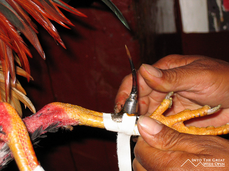 A short while later more people entered, some of them bringing roosters in special bags, I´m not sure where you would buy these bags but maybe there is a cock fighting store or section of the market. There was a bar selling beer, liquor, and soda, but no food, maybe food distracts the birds and compromises the fight. On my trip to the bar I walked in on the preparation ceremony. One man was holding the rooster and had trimmed the nail up on its leg to create a hole. Over this hole he placed a metal plate with a hole in it to use a support that was then taped to the birds leg. Into this metal hole and the nail hole a long sharp needle-like thorn was inserted with the point facing outward and secured to the birds leg with tape.
