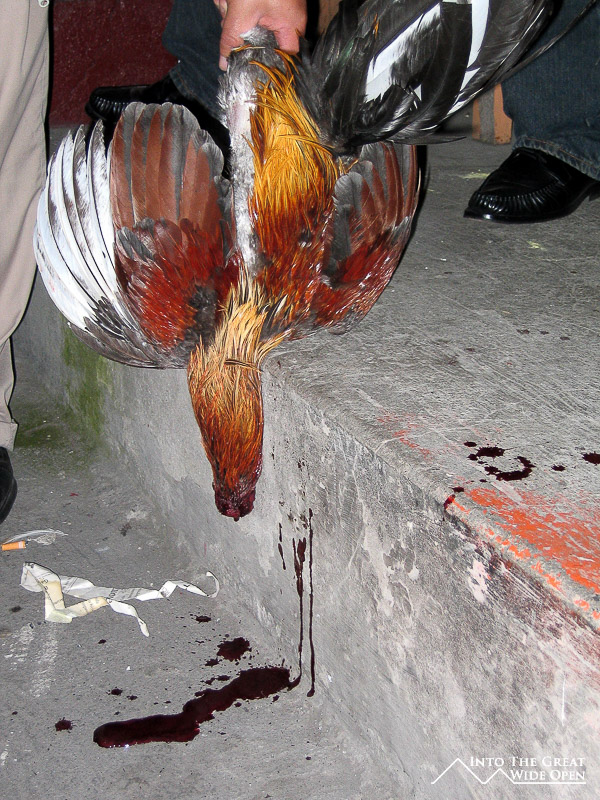 Despite being so close it was hard to follow a lot of the action as it was mostly a high speed flurry of feathers and pecking. The fighting continued until one of the birds got weaker and weaker from losing so much blood due to the cumulative small wounds. Eventually, one rooster would strike a death blow on its weaker counterpart and the bird would go limp and fall down. At this point victory was declared and the birds were separated and removed from the ring. The winner was praised and taken to be cleaned up and rested for another match later in the night. The loser, well, he was not so lucky, in reality, he was still alive, albeit just barely. He was removed from the ring and taken to an area just nearby, leaving a bloody trail along its exit route. Near the ring the losing rooster was held upside down over the concrete floor and allowed to bleed out as it slowly died of the course of a minute or two.