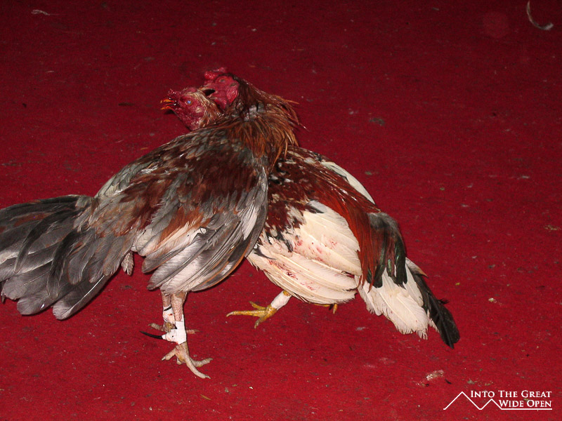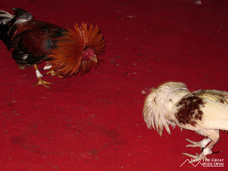 This process was repeated with the other leg resulting in the rooster having two sharp needles with the points facing backward from their legs. The whole time the rooster was shaking as if it was scared, but it wasn´t in any pain, not yet anyways. The first rooster was then brought into the ring and its handler would wave a random rooster in front of it to really rile it up and get it into a fighting mood while its adversary was being similarly prepared. With two roosters in the ring, each handler held their rooster and they touched the heads together, similar to the touching of gloves in a boxing match. After this the timer was set to some random amount and the birds were unleashed on each other. Finally free, the birds quickly faced each other and flared the feathers behind their necks to create almost a hood, in attempt to intimidate the opponent.