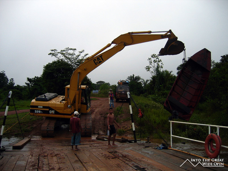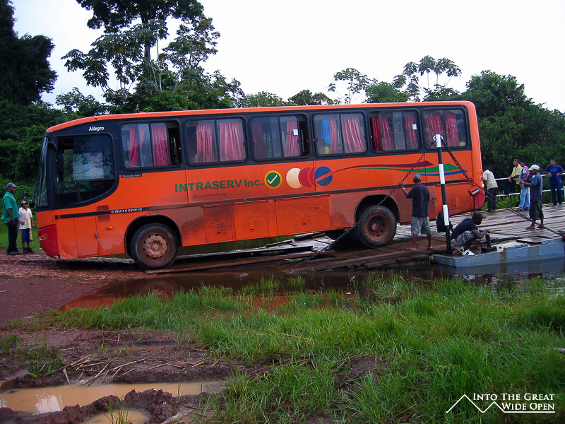 At 6am they took me in the motorboat to the ferry crossing where I got a spot in a minivan bound for Lethem so that I would hopefully be able to get there in time to cross the border and catch the 12pm bus from Bonfim to Boa Vista so that I could then catch the 4pm bus to the Brazil-Venezuela border; otherwise I would be stuck in Boa Vista for the night. Right away the ferry was delayed because a small boat had sunk and was blocking the ferry’s path. A crane had to be brought onto the ferry to hoist the boat out of the water. Luckily the ferry was able to hold the weight of the crane and it pulled the boat out of the water, freeing our path. After crossing the river and registering at one side of the forest we sped across the badly potholed road that more closely resembled the surface of a military proving ground. Our driver was apparently intent on showcasing his driving skills as if this were a time trial for the Dakkar Rally. This was fine by me but despite all this we actually arrived in Lethem a little bit after 12pm, however, I still had time to catch the bus at 2pm.