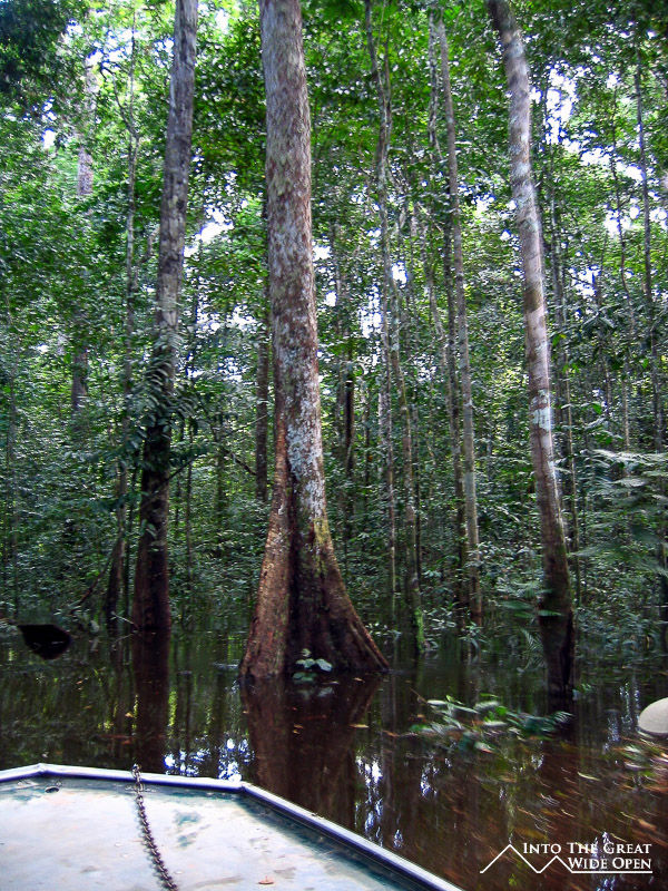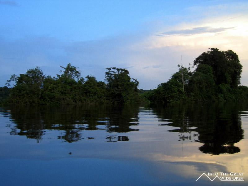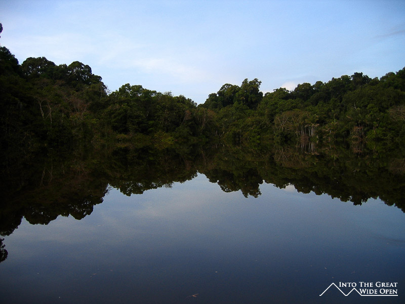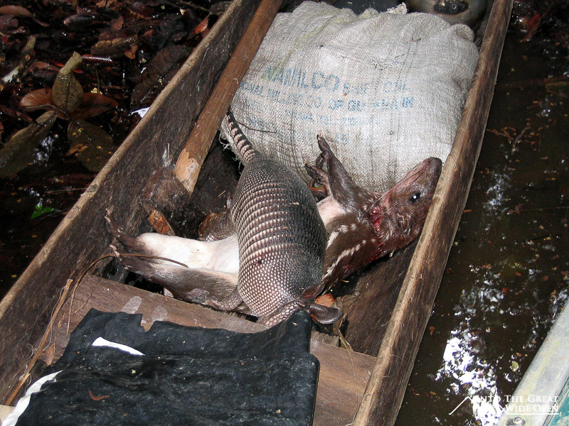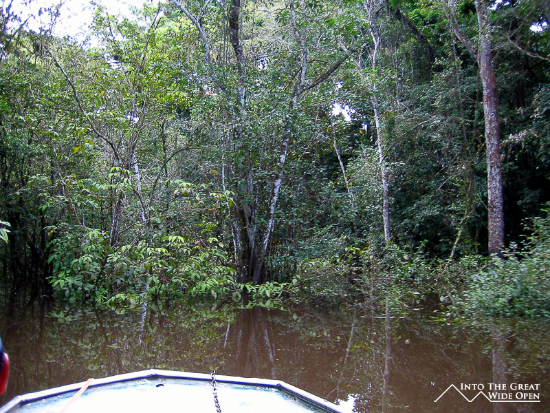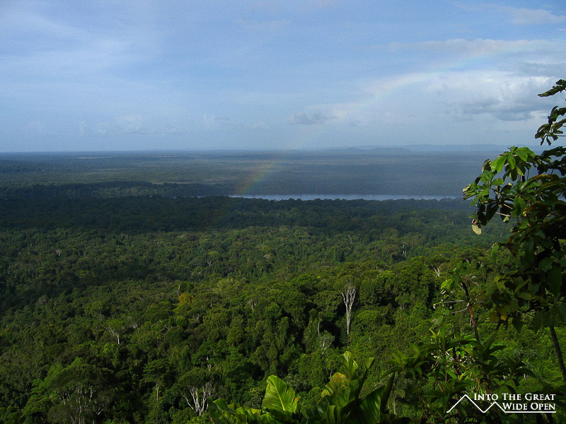 I decided to go on a hike to Turtle Mountain that involved a short boat trip followed by hiking through the jungle to the top of the mountain where you have views over the forest canopy below. The high water level meant that the boat needed to navigate through the submerged trees to reach an alternate landing site where we found a local indigenous man who had just finished hunting and having caught an armadillo and two other jungle rodents he was preparing to smoke them. Apparently smoking is the ideal way to prepare armadillo meat. The trail through the thick jungle was hot and humid and hadn´t been used in quite some time as we came upon one section that had been blocked by a downed tree. We saw several really interesting birds, including one that apparently is really rare and hard to find. But in terms of other animals we saw none, only the tracks of a jaguar along the trail. After a while we eventually reached the top of the mountain and were afforded amazing and sweeping views of the jungle canopy and mountain escarpments off in the distance. From our perch on top of the mountain we could look down on flocks of parrots, macaws, and other birds and listen to the distant sounds of the howler monkeys establishing their territory.