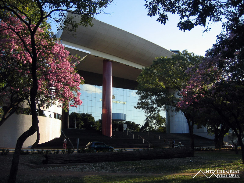 Since he had no plans either we walked around to check out the parts of the old city such as the government buildings and the main plaza. There was a museum in the cabildo with what seemed to be all sorts of random stuff that had been found and just thrown together to take up space, one section of old music memorabilia, dresses, modern art, indigenous crafts, and of course some old city history. Nearby the cabildo was the very impressive government palace, a massive white complex almost enclosing a huge entry plaza with an enormous flagpole flying a huge Paraguayan flag. Sadly the armed guards were very insistent that we not get too close to the blocked off entrance and there were no public tours of the building. The new legislative palace was adjacent to this and was constructed of metal and glass in modern style; it certainly didn´t fit with the other historic or simple old buildings in the area.
