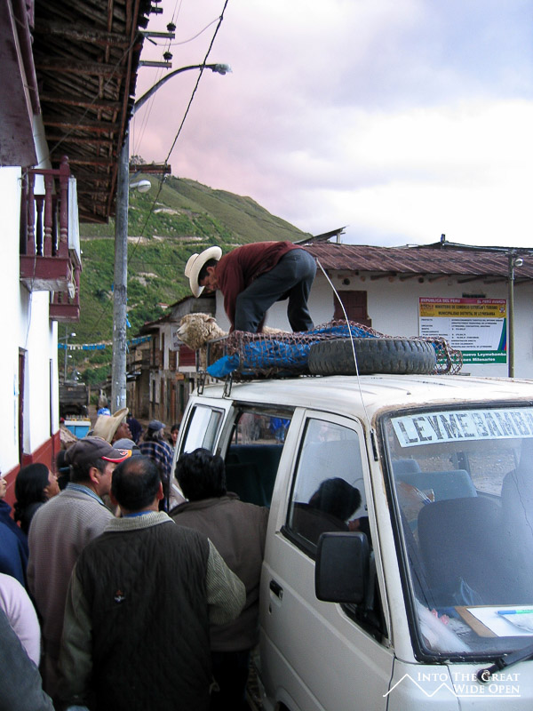 With no guarantee of a seat, and knowing the quality of the roads, I decided to take the van and had to drag myself out of bed before dawn to wait for it to arrive. The clerk at the hotel had reserved a spot for me so I just had to wait until about 6:15am when the van finally showed up with a sheep roped to the top. As all the bags and cargo were loaded on, the sheep was moved so that it nestled in snuggly with the spare tire and a tarp was thrown over the other bags on the roof. Inside, the van there was a mobile farm with a sack of live chickens, a sack of guinea pigs, and a woman´s dog. Before we started there was a foul smell in the van and this man handed out a sack of raw meat that had to be placed on the roof, as the stinking raw meat in an unrefrigerated and unsealed bag would have been too much for all the passengers to bear. Finally we were ready to go as the van pulled out of town around 6:30am.
