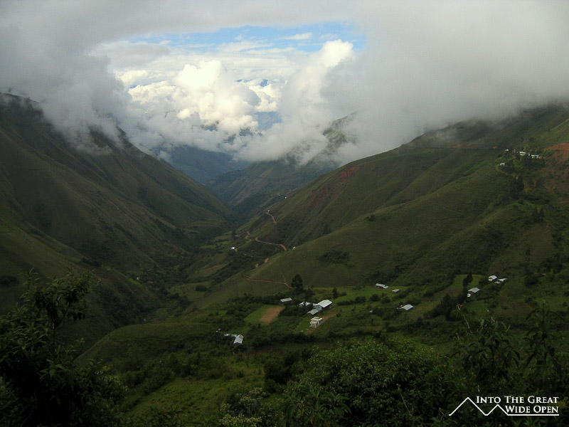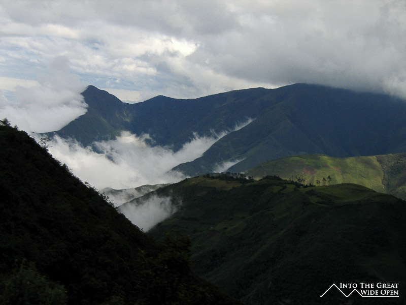 From Leymabamba the road climbed steadily up the mountains from 7,000 feet to the cold and foggy mountain pass at about 11,500 feet. After leaving Leymabamba, there weren´t really any towns, only a few houses scattered here and there, and no electricity either. Most of the hillsides were totally covered in vegetation and it was understandable how some ancient ruins are still being discovered. Past the mountain pass the road dropped continuously for about 3 hours. We emerged from the cold, damp fog of the high mountains to an elevation in between the clouds with more clouds above and clouds and fog below. The views were just amazing and I was lucky enough to get a few decent pictures as the van rumbled along the poor and potholed road. Still moving downhill we stopped for breakfast at about 9:30am at a restaurant on the side of the road, and by restaurant I mean a mud brick hut with three women cooking on a mud brick stove over a wood fire.