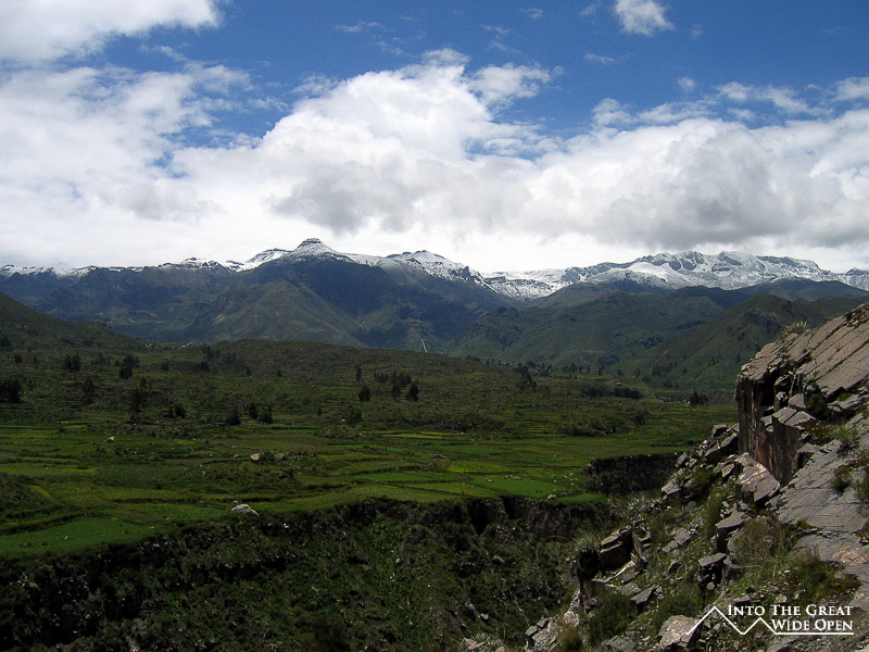 Everywhere I looked the tour operators were advertising Colca Canyon as the world´s deepest canyon, which is in fact not true. Personally, I dispute the fact that it is a canyon, but I´ll get to that later. The deepest canyon is actually Cotohausi Canyon, several hours north of Colca Canyon, which at its deepest point is about 150m deeper than Colca Canyon. If you believe the numbers, Colca Canyon is around 10,000 feet deep. The reason that I dispute its status as a canyon is that it is really more of a gradually sloping river valley than what you would traditionally think of as a canyon. Rising up from the river is a hillside of terraces that leads up to a small plateau and then from that plateau the mountains rise up to the snow covered peaks.