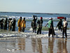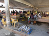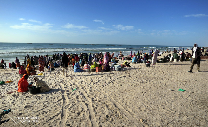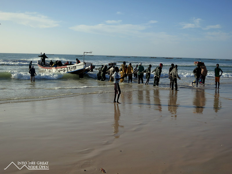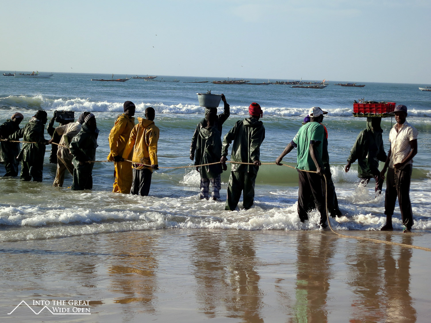 Getting out of the taxi I could already smell that I was near a fishing port. Here, as in Saint-Louis, traditional wooden fishing boats pull onto the beach and are unloaded the old fashioned way. A human chain of people is formed to real the boat in and then the catch is carried off in buckets on top of people’s heads to the nearby market. All of this occurs amidst a sea of people on the beach. There are young kids playing soccer, old people praying, vendors selling food and drinks, men fixing boats, etc.