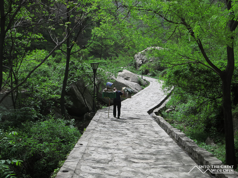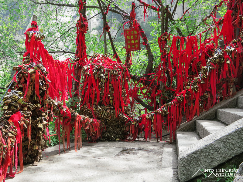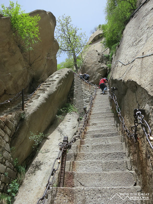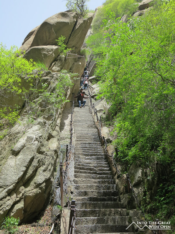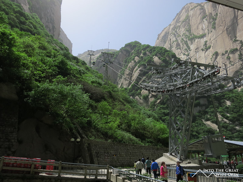 To escape the crowded streets of Xi’an I decided to take a day trip to Mt. Hua Shan, one of five sacred Buddhist mountains located about 100 kilometers away. The near vertical stone walls rise straight up from the ground and culminate in a series of peaks, each successively higher. There are a few options for getting to the top but I opted for the 6 kilometer hike up a decent grade paved path that before long turned into a steeper and steeper array of very narrow stairs carved into the stone of the mountain. The steepest sections were almost like ladders with chains on the side to help people make their way upward. Nonetheless it was a pretty walk up through the canyon until reaching the top of the North Peak. It is a popular route but even still I was surprised to see so many people clearly not prepared for something so rigorous, in fact I didn’t expect it to be so challenging. Luckily the weather was nice, otherwise the stone stairs would no doubt have been slippery and treacherous in inclement weather. As I was heading back to Xi’an in the afternoon I didn’t have time to ascend to the higher South Peak. Judging from the view of the trail – a winding length of stairs along the spine of the mountain – and the fact that I could barely see the bottom of the mountain from where I was through the smoggy air, I don’t think I missed too much. Being somewhat lazy and wanting a different view I opted to take the cable car down to the bottom and save my knees from having to go down the same set of stairs.