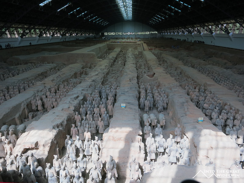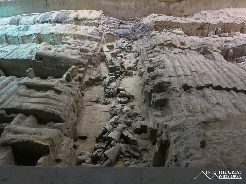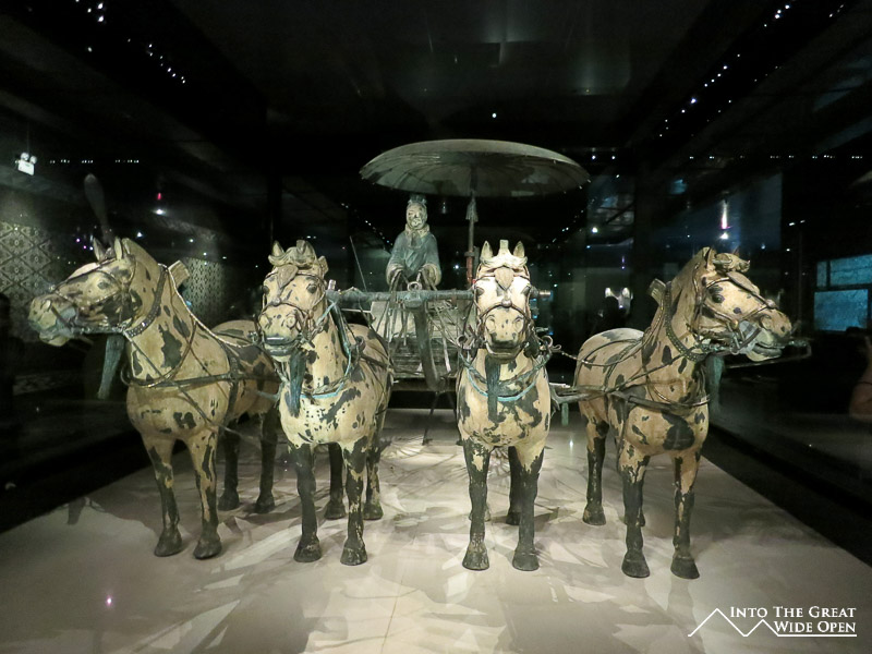 The main attraction, the army of the terracotta warriors is one of the more touristy places I have been, even by Chinese standards. To reach the museum you are forced to walk through a labyrinth of tacky souvenir stores and overpriced restaurants all offering nearly the same things. The huge numbers of tour groups and independent tourists make navigating this a mess as people are inexplicably distracted by the bright and shiny objects and can’t resist stopping abruptly to look without notice. Once you are finally inside the complex there are three pits of archeological finds with only the first pit having been excavated and restored to any semblance of its past glory. Towards the back of the first pit there are people actually working on restoring and rebuilding more soldiers, making for quite the real life jigsaw puzzle. The site must have been a spectacular vision in its time with several thousand figures accurately sculpted and ordered according to rank, just as they would have been in a real army. In their time the figures were painted in colorful pigments only adding to the glory. Pits 2 and 3 show only partially excavated areas with jumbles of broken terracotta fragments scattered about, the result of years of weathering and exposure to the forces of nature. There is also a small museum with a few interesting pieces like two bronze chariots that were unearthed from the ruins.