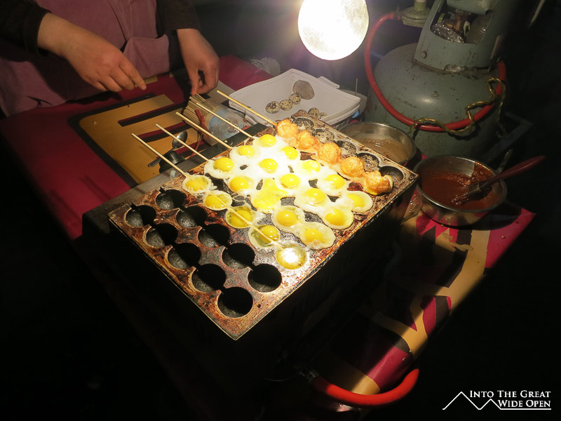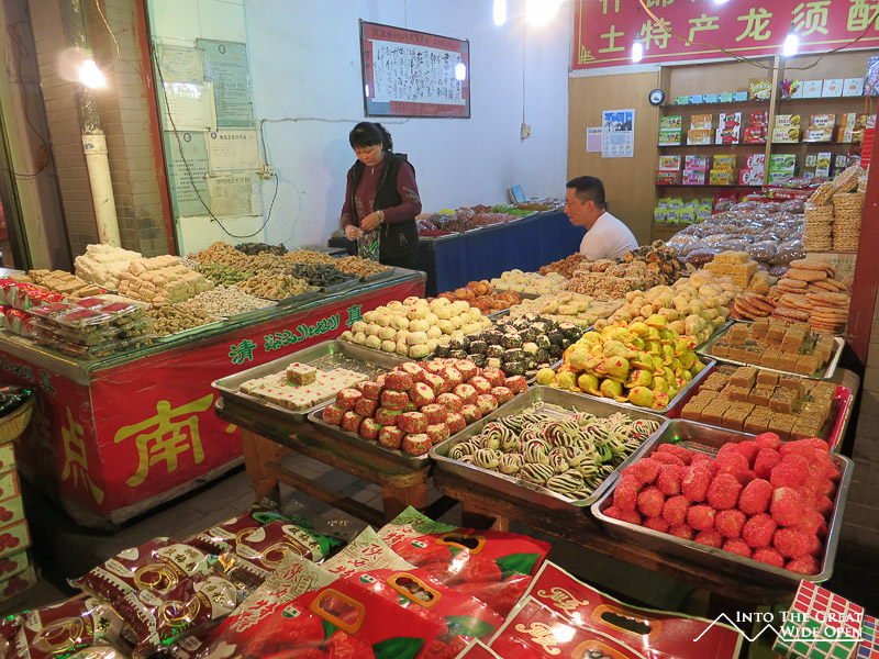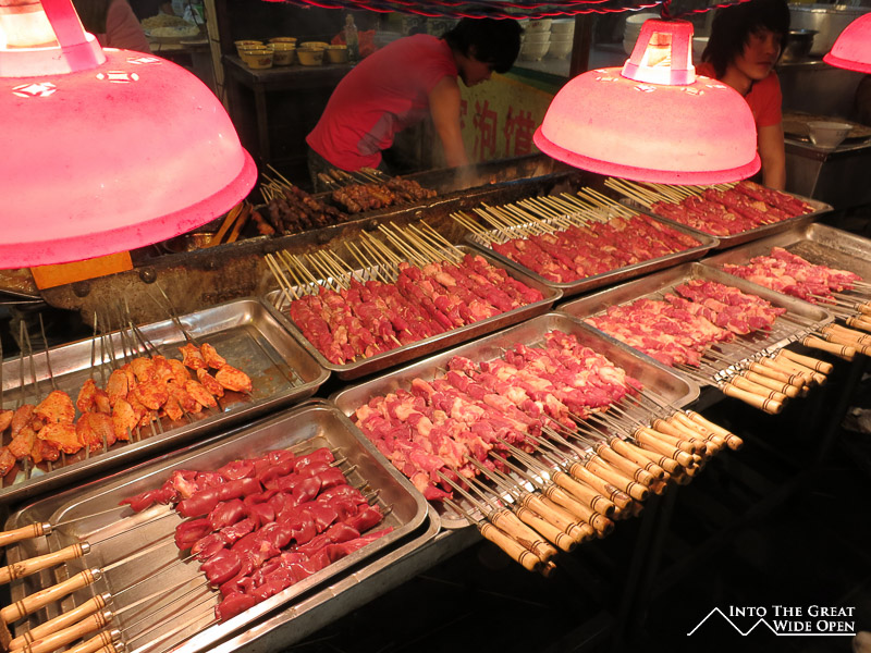 Among the more interesting areas of the city is the Muslim Quarter. There is a large mosque on the southern end of the Muslim Quarter, from which lead streets lined with market stalls selling all types of street food, fruits, vegetables, nuts, clothes, souvenirs, and other trinkets. At nighttime the neon lights come on and the crowds come out to stroll the narrow streets and alleyways, sampling the food and taking in the sights and smells. Some of the more unique food items I had included fried quail eggs on skewers lacquered with either spicy pepper sauce or peanut sauce, square cakes made with a type of peanut flour that crumbled in your mouth, cold noodles and vegetables with a blend of soy sauce, peanut sauce, and chili oil, and small sandwiches of chopped lamb. There are also large assortments of freshly grilled meat on skewers, a more traditional street food.