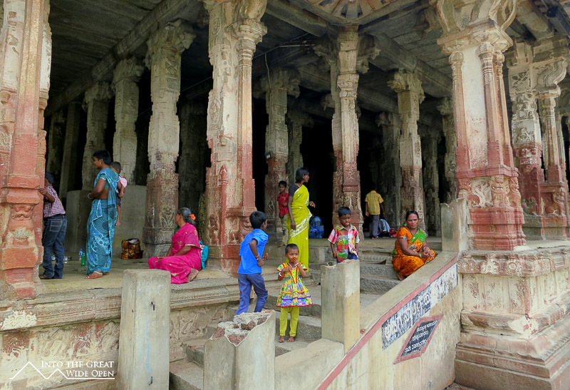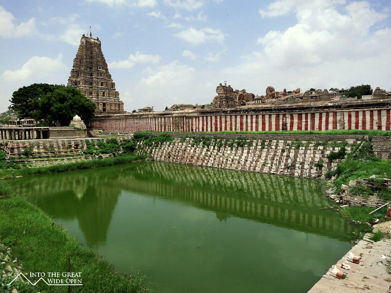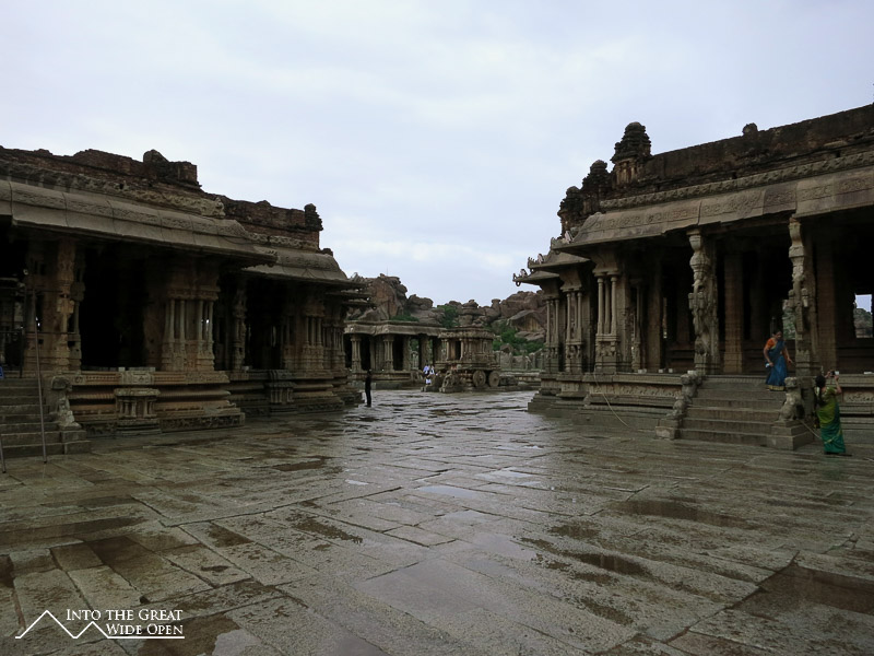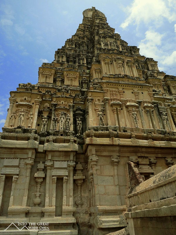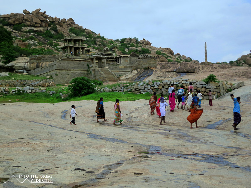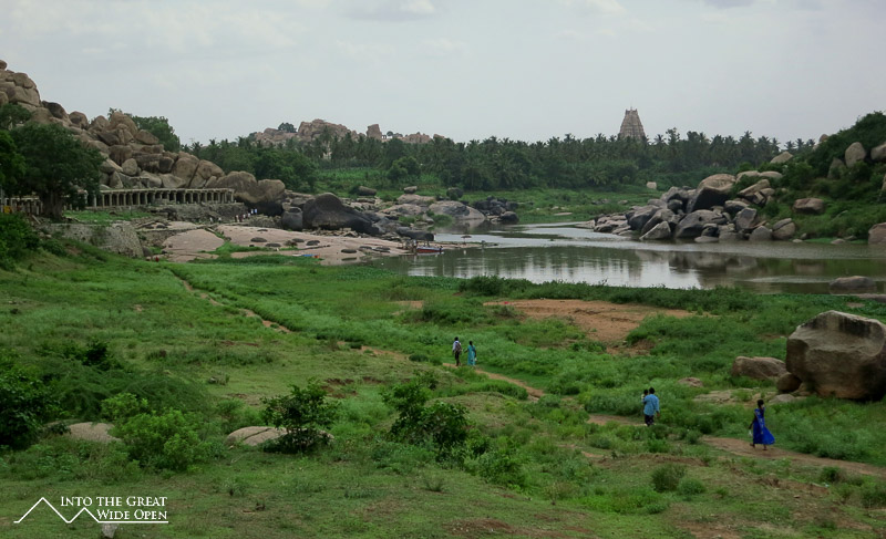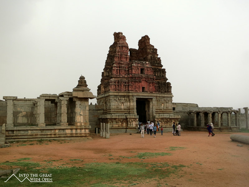 The north section of the site occupies the banks of the Tungabhadra River. Small boats ferry people across and up the river to reach some of the various sights. The two larger temple complexes, the Virupaksha and Vitthala Temples sit at opposite ends of the site. The large central tower of the Virupaksha Temple is visible from numerous vantage points throughout Hampi. On the pathways linking these two temples are numerous smaller temples. One of the more amazing views is of the Tiruvengalanatha Temple from atop the hill past the giant bull statue. In the emptiness of early afternoon it truly looked like a set from an Indiana Jones movie. After hiking down to the temple, single file lines of local people were transiting the temple courtyard in their brightly colored clothes, highlighting the otherwise bleak surroundings. Many of the temples feature exceptional stone work and decoration; the obviously cleaned and restored red front of the Vitthala Temple being a prime example of this.