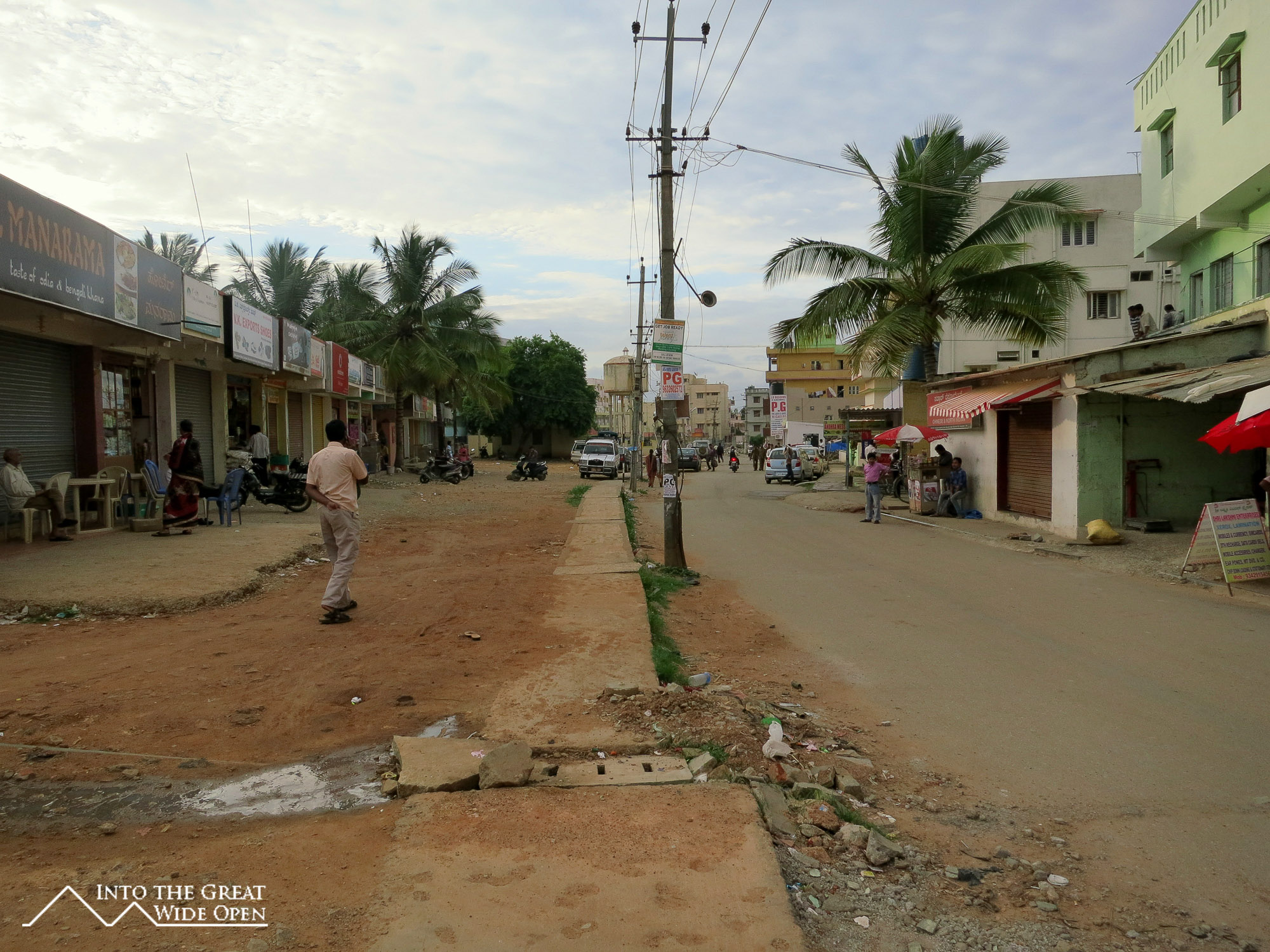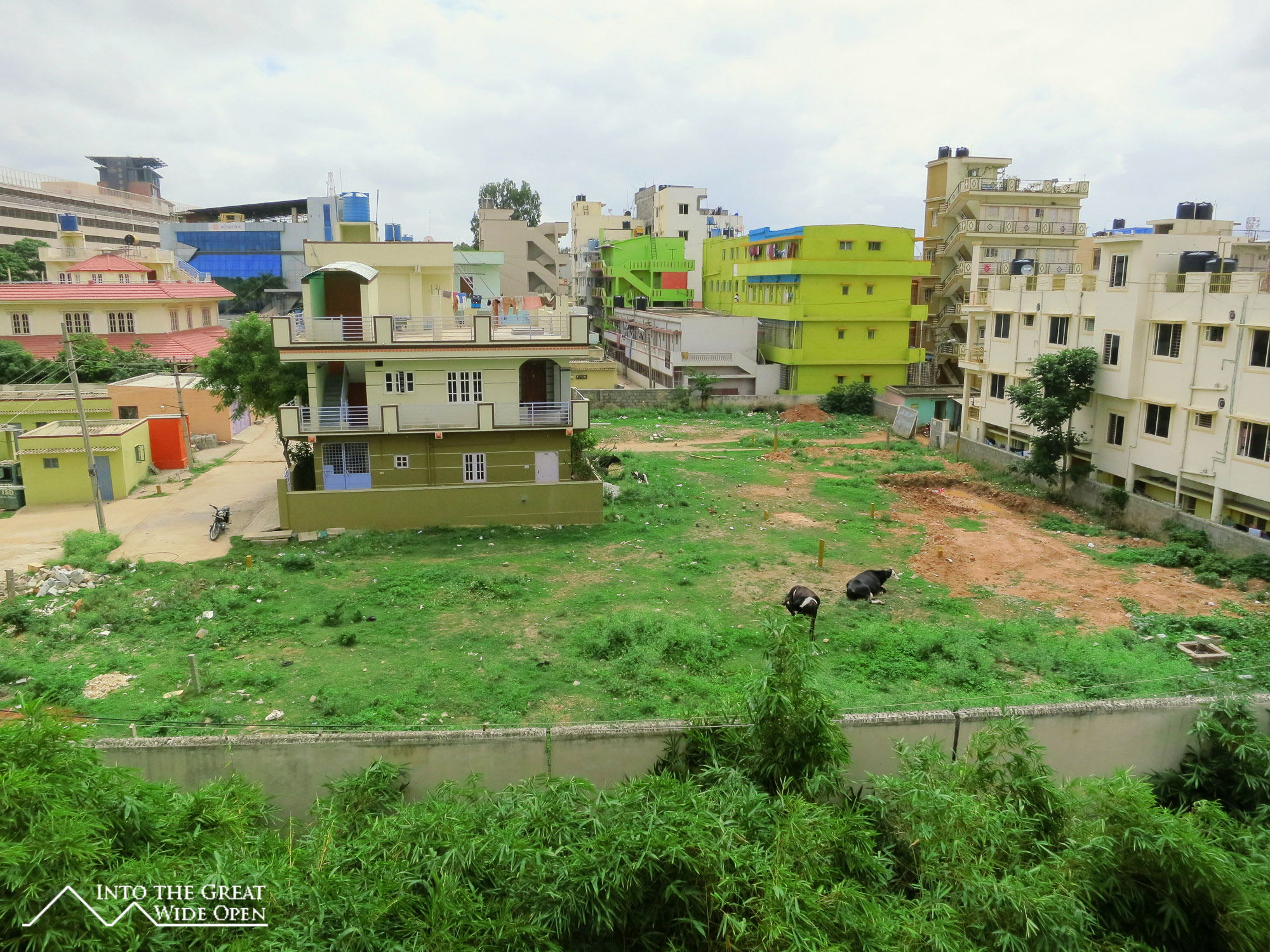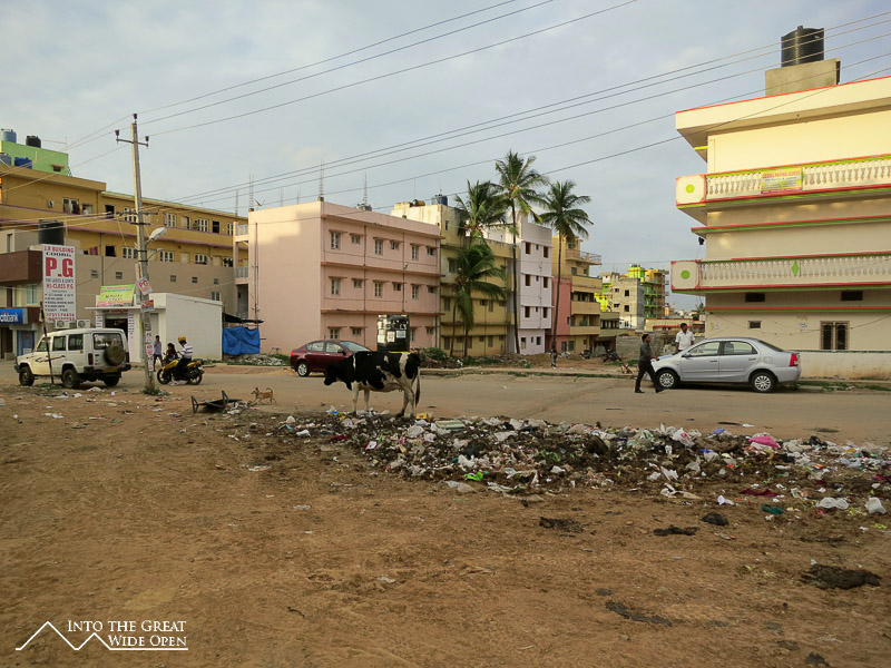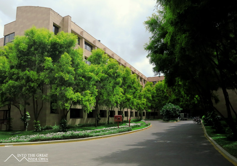 The peaceful and serene nature of the campus is a stark contrast to the real India that lurks outside the walls. Beyond the 8,000 volt electric fence a harsh chaotic world abounds. Exiting the back gate after passing through the X-ray baggage scanner and metal detector is a dusty street lined with run-down buildings and piles of trash. A lone cow grazes on heaps of trash as commuters file by.