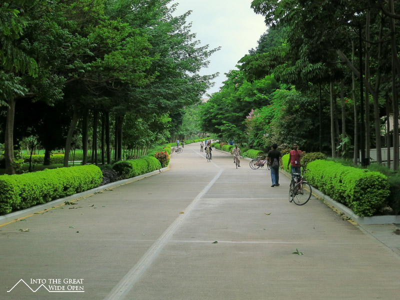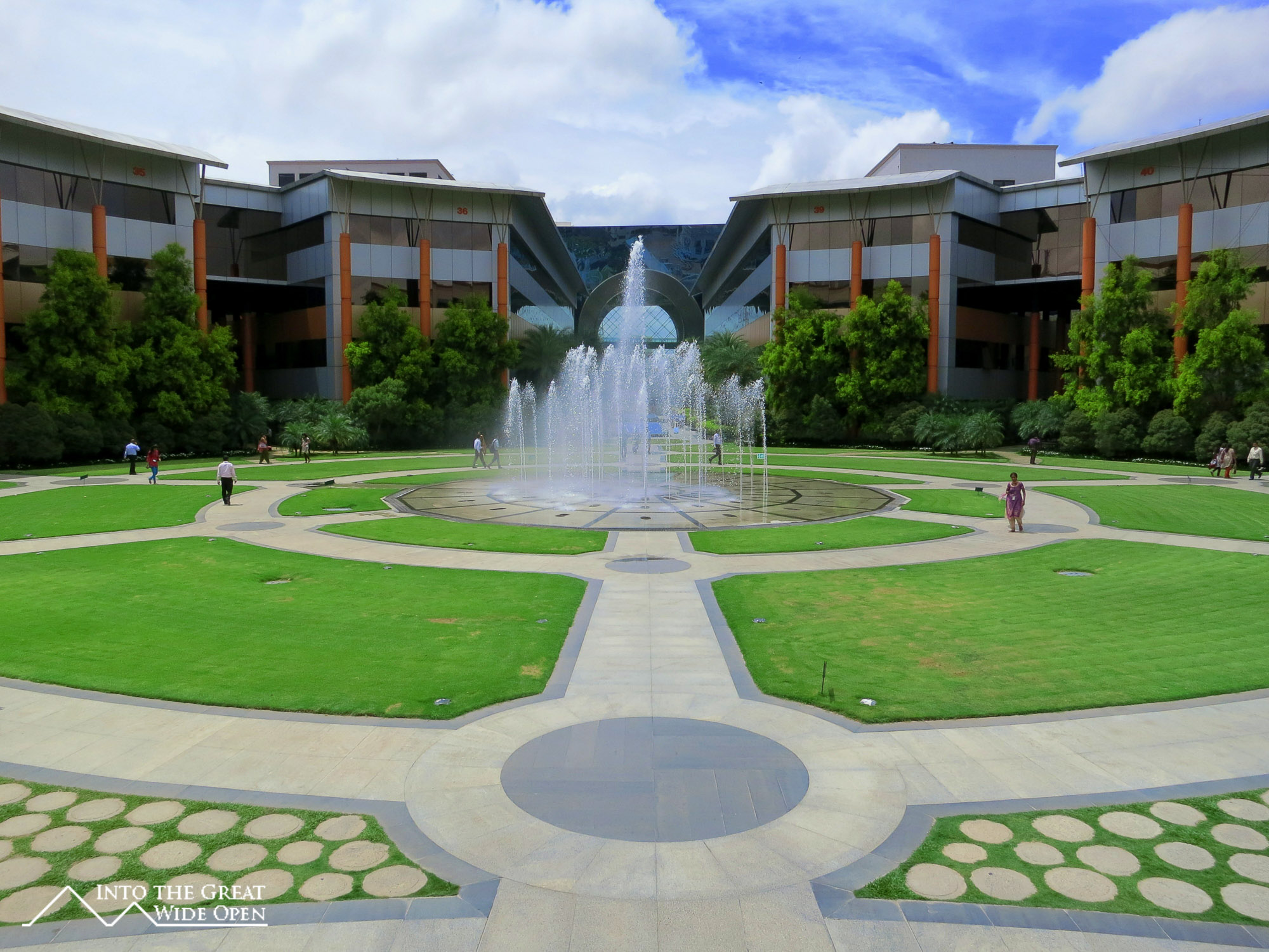 Infosys has a large campus, which during the week is bustling with about 30,000 workers. The sleek and unique buildings have exotic names like “The Pyramid” and “The Washing Machine.” Leafy pathways and roadways are filled with pedestrians and people on the free bicycles that speed the commute between the numerous buildings. There are multiple food courts serving all types of Indian food and even a few Western options.