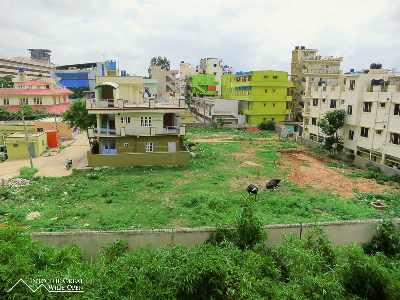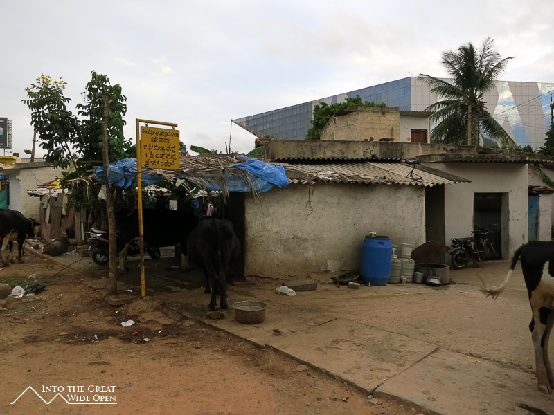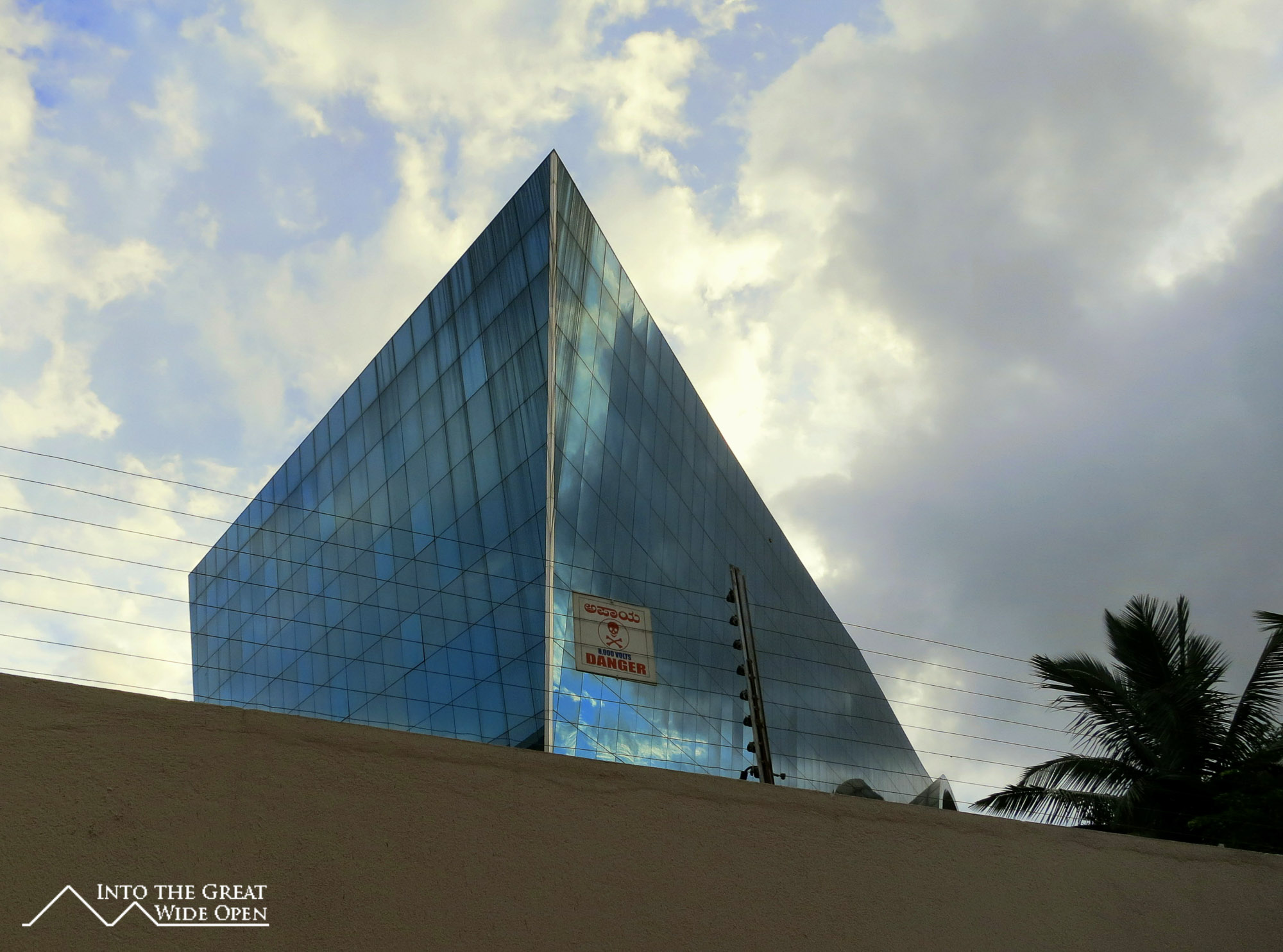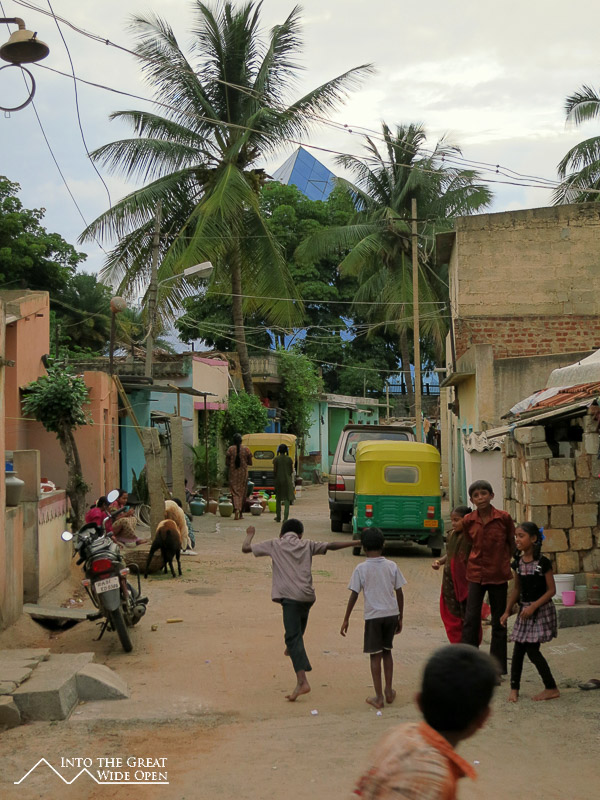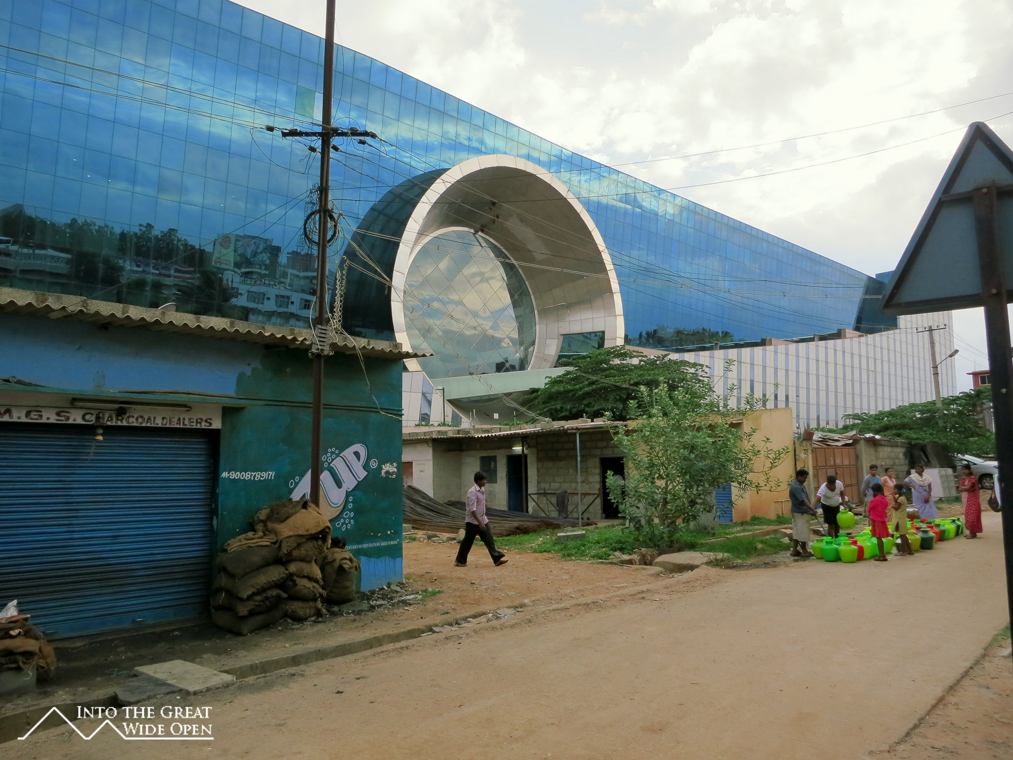 In the background the top of the modern buildings from the Infosys campus can easily be seen. The juxtaposition of this and the real life on the street is startling. The views of people collecting water in containers behind “The Washing Machine” and children playing barefoot with the tip of “The Pyramid” towering above a palm tree are very unique. Seeing the closeness of these two worlds makes you appreciate the heightened security: guard towers, surveillance cameras, electric fences, and patrols of guards armed with automatic weapons.
