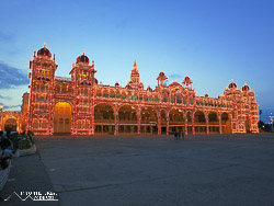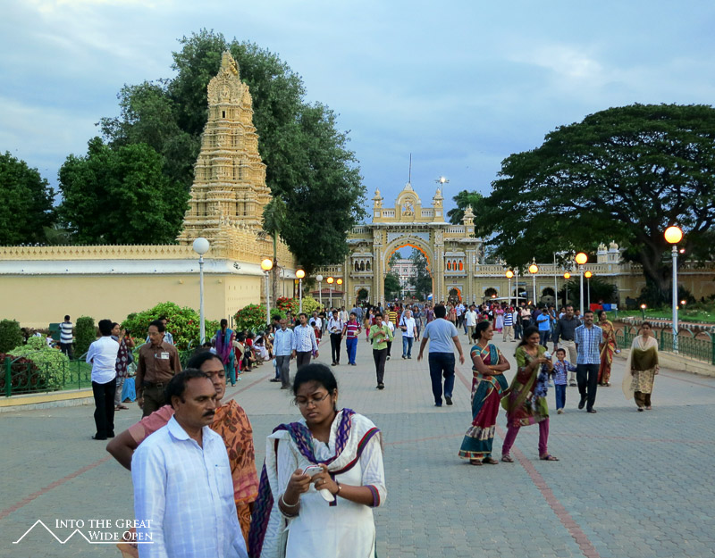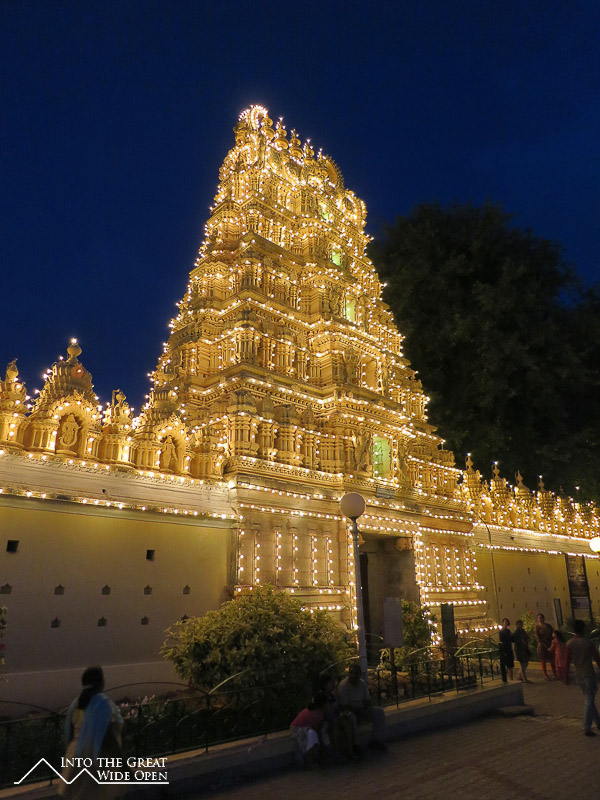 At exactly 7pm the thousands of light bulbs adorning the Mysore Palace are illuminated and you can actually hear the sounds of the bulbs popping into action. The sound is so loud that it startles the birds that have come to rest on the palace. The lighting of the palace is only done on Sundays and public holidays so the grounds were crowded with families and tourists eager to see the show. Along with the lights there was low volume music being played by something resembling an orchestra at the base of the palace. As darkness fell, the 98,260 light bulbs shimmered in the twilight drawing the focus of everyone’s camera or cell phone.