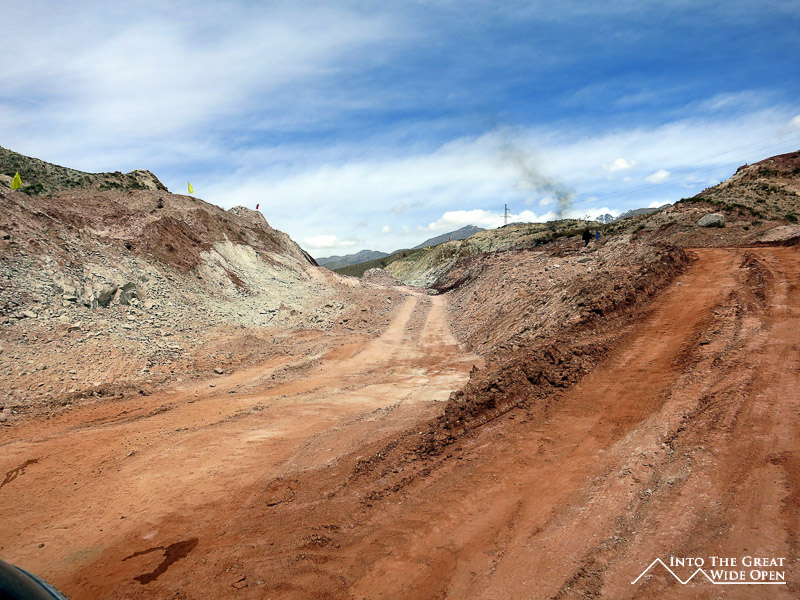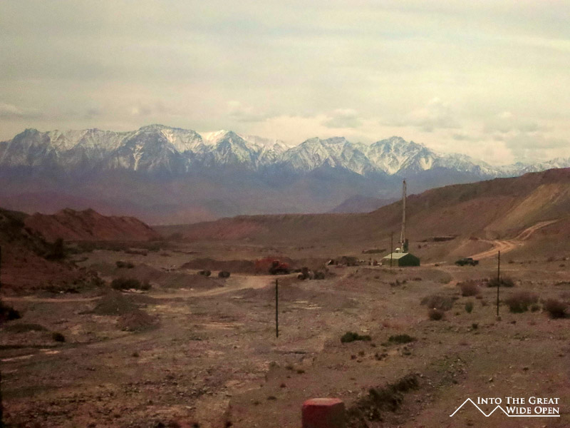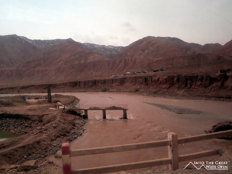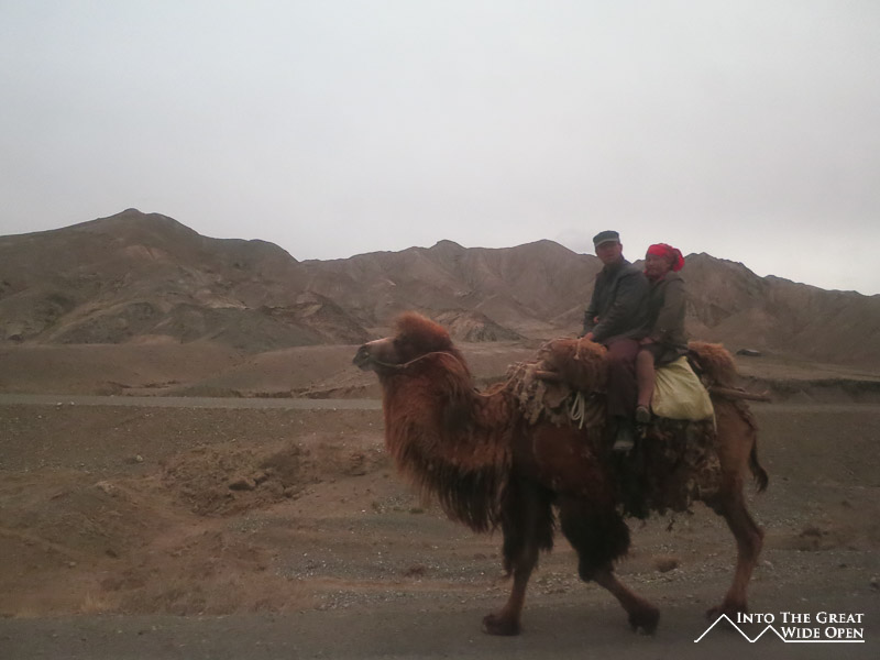 Not long after leaving Ulugchat the paved road ended and we were stuck with a rocky dirt track that was sometimes, but not always, adequately marked. The scenery along much of this route was through a dry canyon with walls colored from red to gray. All along the way we could see roadwork being done to hopefully someday pave this stretch of road, but from the looks of it this was obviously a long way off. In the distance behind the dry desert landscape we could see the snowcapped mountains looming above landscape. Our driver was in a rush, as he had to pick someone up at the border before going back to Kashgar, so he was driving like a madman around these ragged roads. At one point we came to a fork in the road and neither option looked acceptable so he got out of the car to scout out the options before realizing that we had lost our way a kilometer or so back. Further on the road we were flying down the road and crested a hill when the road immediately branched into two diverging paths. Our driver was faced with a split second decision and he seemed to realize about a second too late that we needed to go left instead of right. Luckily he decided not to jerk the wheel over at the last minute or else our car probably would have rolled over.