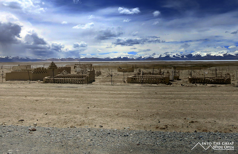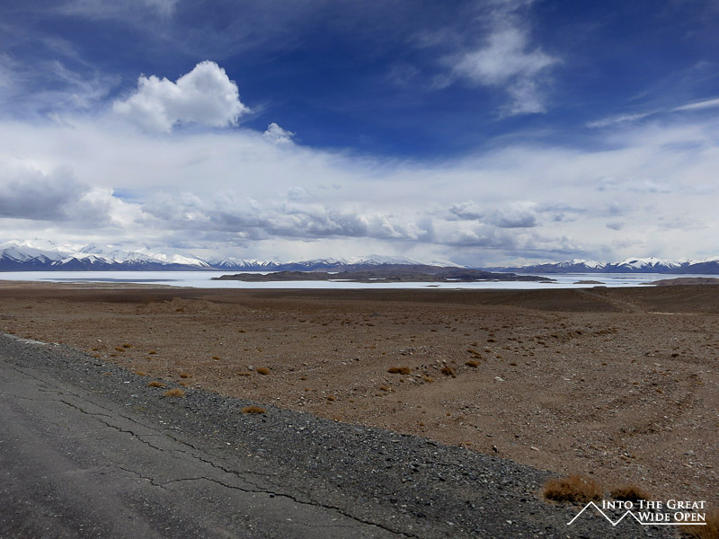 After such a stretch of emptiness the glare of the big white expanse of the still frozen Karakul Lake was really remarkable. All around the western edges of this high altitude plateau the snow covered peaks of the Pamir Mountains ringed the lake. At almost 4000 meters the salt water lake was still nearly completely frozen over in the second half of May. On the shore of the lake we stopped at the village of Karakul for a late lunch of soup and bread. The few whitewashed buildings of the town were gathered around dusty dirt streets with residents moving about with their faces covered for protection against the altitude, strong sun, and biting wind.