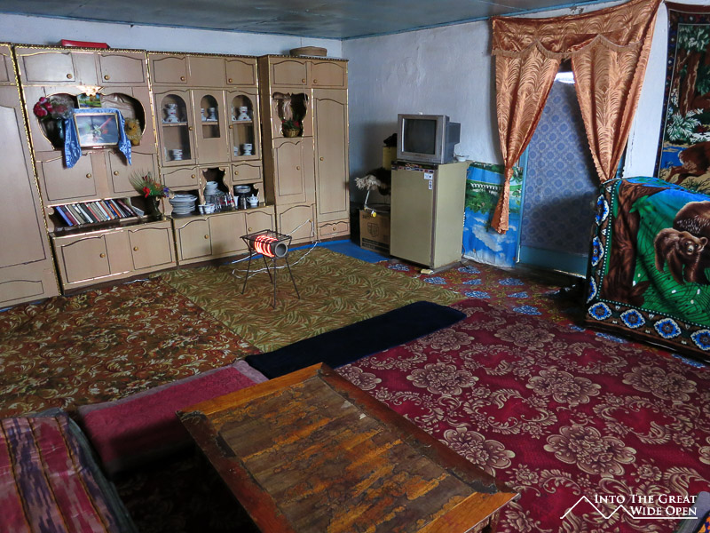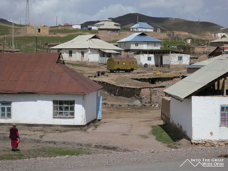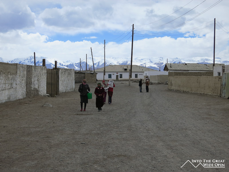 On the other side, at the base of the pass sits Sary Tash, a tiny village at the junction of three border roads. To the east the road leads to China through the Irkeshtam Pass, to the southwest the road heads towards Dushanbe and to the south the road travels through the Pamir Mountains to Murgab and Khorog. Sary Tash seems to exist solely to serve those in transit to or from these places. It is at such a high altitude (3100 meters) that there are no trees and nothing grows higher than a few random weeds. The town has a few “cafes” which are really just stores selling stale cookies and possibly some packaged cheese and salami but nothing fresh, not even bread. I spent the night here, arriving too late in the day to attempt the next stretch of the road to Murgab. In the late afternoon the bright sun made it warm and pleasant to walk around the spread of houses near the crossroads. There were children playing in the streets after school had let out and a few trucks rumbling through on their way to other places. I found a place to stay in one of the two or three guest houses in the village, my room consisting of the floor, a small table, some pads and blankets, and an ancient heater that was adequate enough considering it was just electricity running through a metal wire wrapped around a ceramic tube. At night the bitter cold from the altitude drives people inside and the one restaurant in town with terrible food empties out as the truck drivers move onward towards their destinations. Walking back to my room I could see people watching black and white TVs in their small houses.