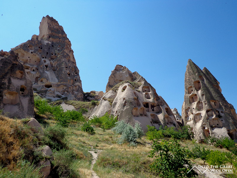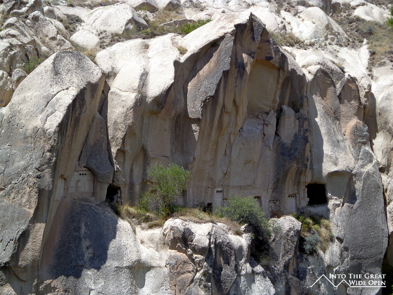 I walk past tourists speaking Italian, Spanish, Portuguese, English, Turkish, Russian, French, German, Korean, Japanese, Chinese, and Hindi, among others I am sure. The town is full of tourists and there is no escaping its touristy feel. The Open Air Museum features rock formations dotted with caves: living quarters, dining rooms, kitchens, and churches. With all the tourists and their tour guides it is hard to move in these small spaces, not designed for modern people of our size or for these group sizes. The caves themselves are not overly interesting and after queuing in line to see many it often doesn’t seem worth the wait when you enter a barren cave. Many of the higher level caves are inaccessible, perhaps due to blocked or unstable passageways. The way the people must have lived is what is interesting but there is little information or recreations to detail daily life in a cave complex such as this one. All that remain are artifacts like carved stone dining tables, rooms with shelves for storage, and kitchens with ovens for cooking.