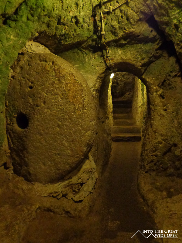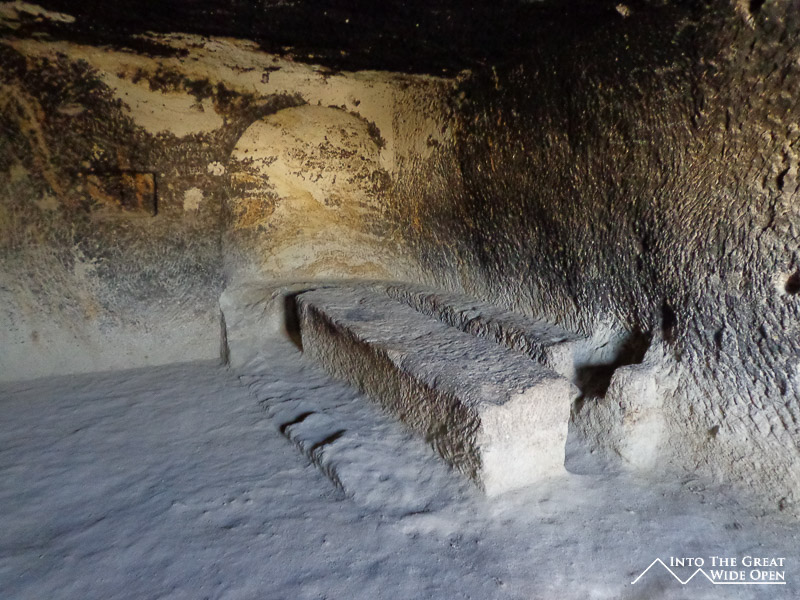 The underground city at Derinkuyu offers a change of pace from the monotony of seeing cave after cave after cave. Here a labyrinth of tunnels and stairways lead deep beneath the earth to a complex of chambers comprising a small city. Bending and stooping to navigate these tiny chambers amidst dim lighting and few signs was an unreal experience. At times it felt like being on the set of an Indiana Jones movie, complete with giant stone doors that could be rolled shut to seal off passageways. Returning to the surface was a welcome experience, except for the glaring sunlight and oppressive heat; perhaps that’s what drove these people underground to begin with.