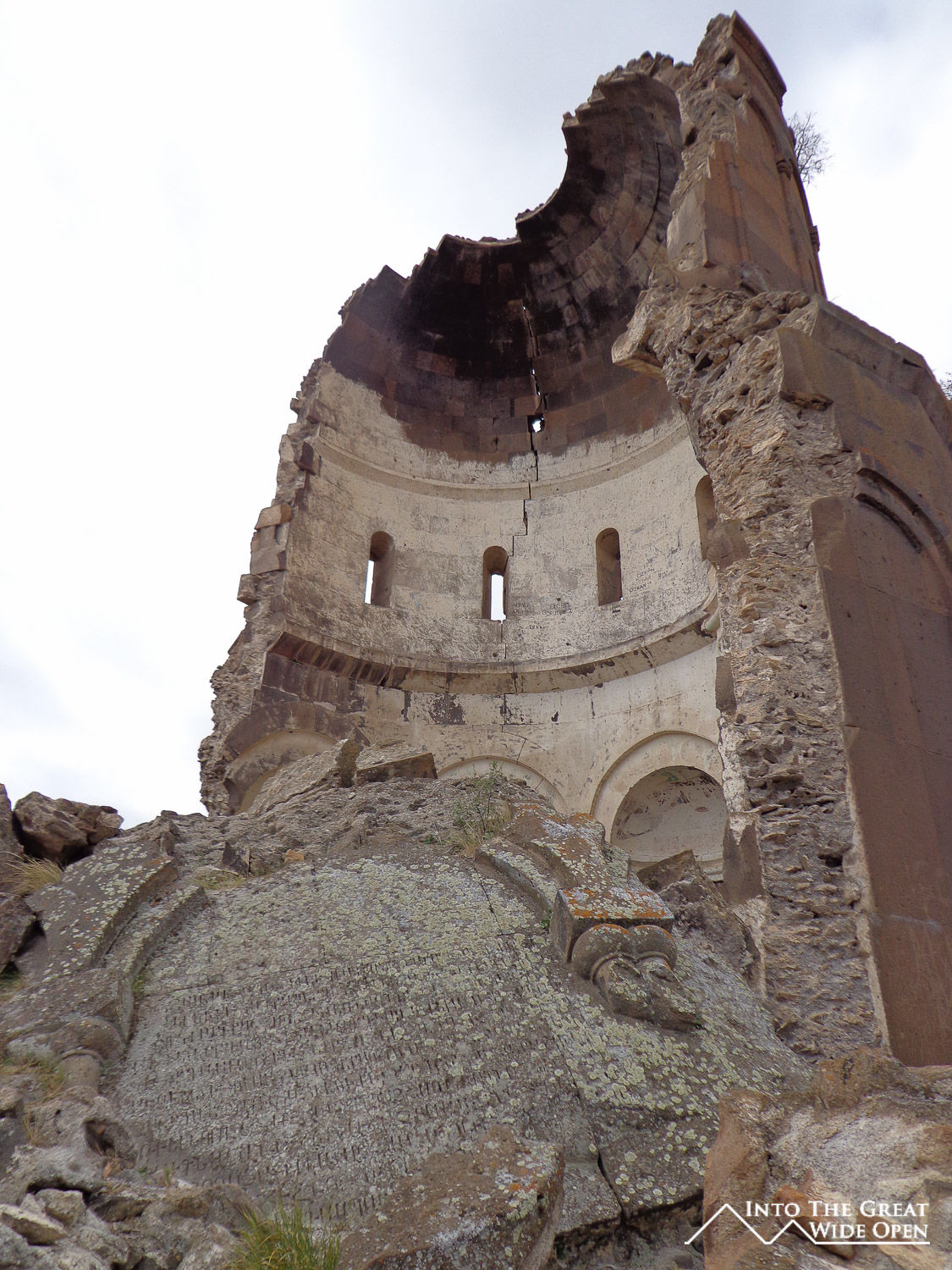 Much of the site itself is un-restored ruins with a few grossly over-restored exceptions. Years of exposure to the elements, both natural and human, have left many of the buildings crumbling to pieces. The best example is the Redeemer’s Church, or exactly the half of it that remains. The weathering of the buildings has produced some amazing effects with grasses and weeds sprouting from the roofs and walls and ceilings caving in to let in the natural sunlight. An interesting thing about the site is the array of buildings, there is a mosque (the first one in Anatolia no less), there is a Georgian Church, there are Armenian Churches, and there is even a Zoroastrian Church. Thankfully there are no decaying Soviet buildings to lend an air of depression to the site. The most appropriate artifact in the site is an ancient bridge across the river, the only possible link across the deep river gorge, which lies in ruins, much like the current relationship between Armenia and Turkey.