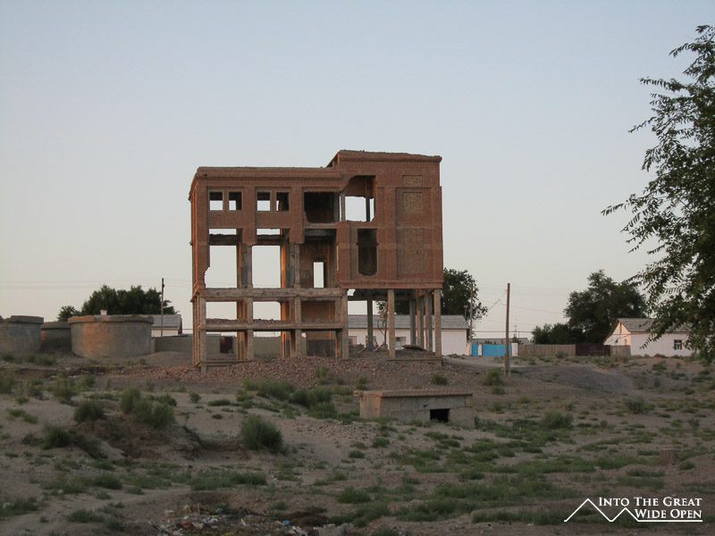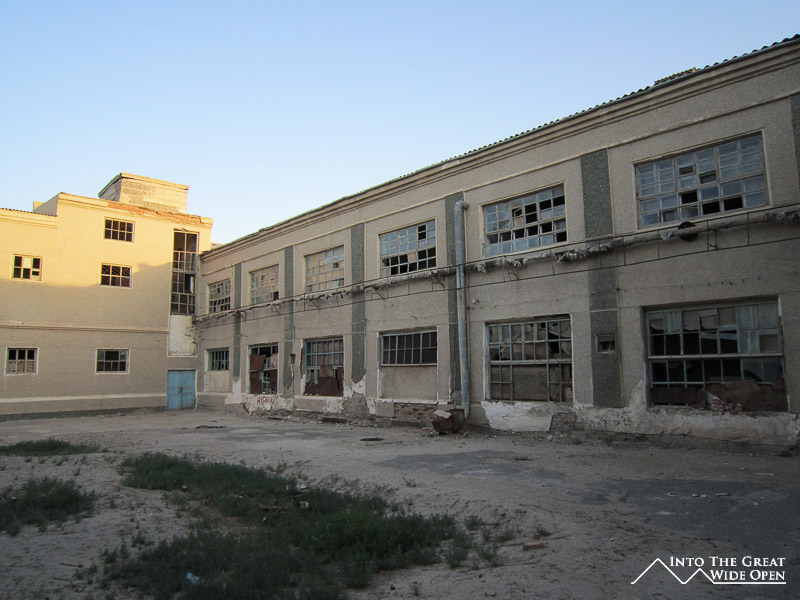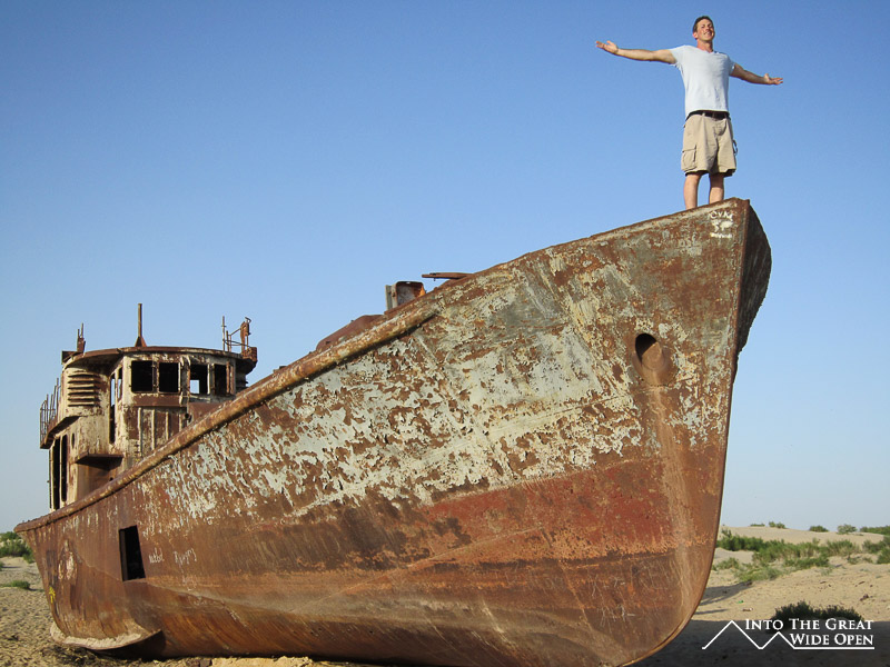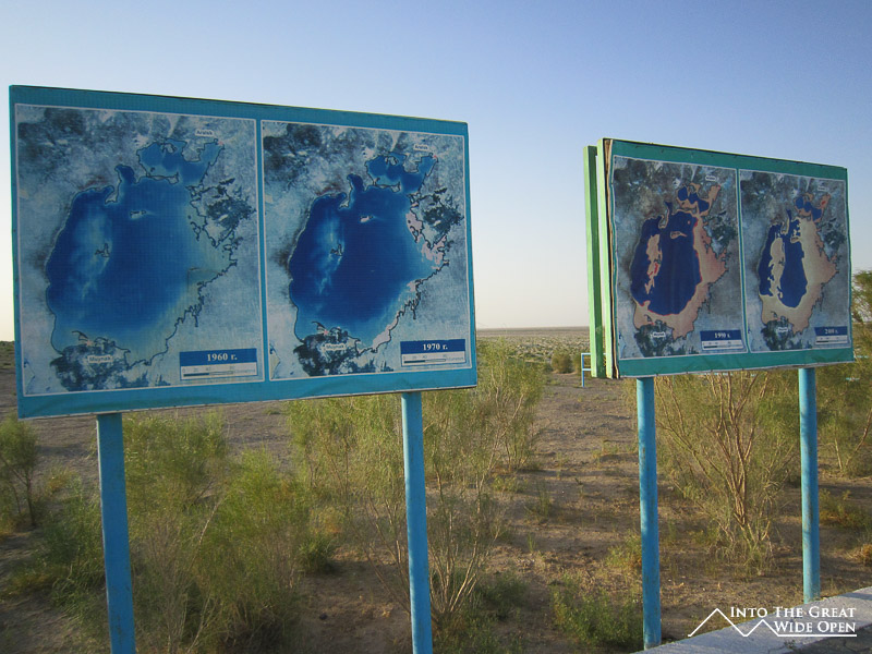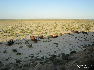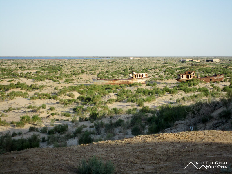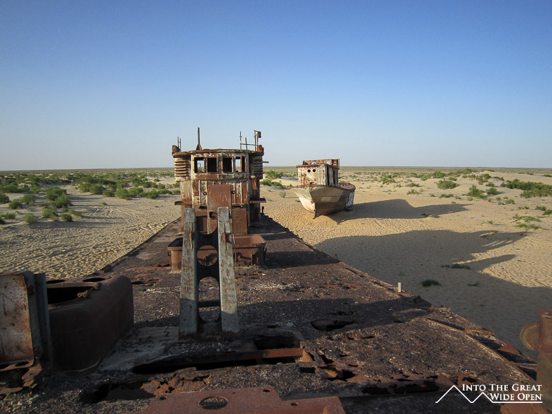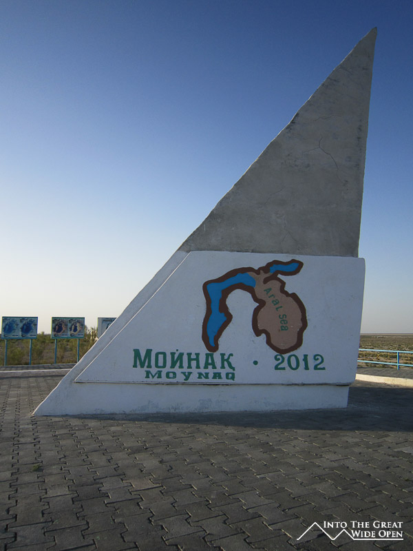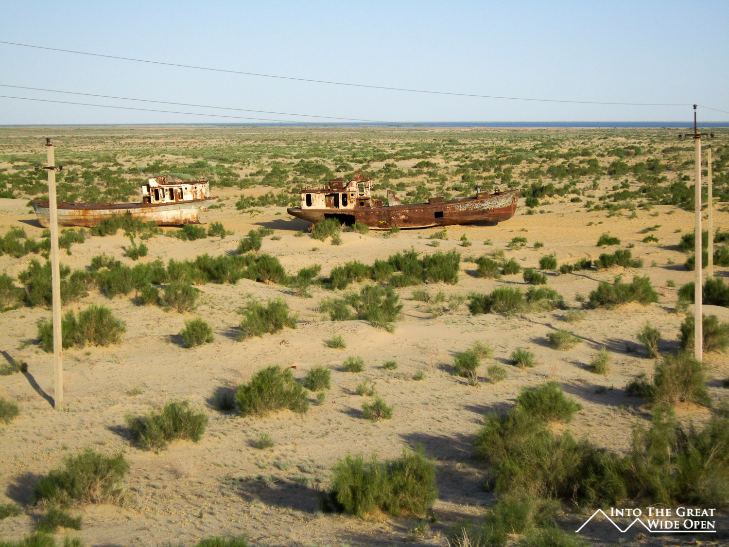 At the end of the road through town there is still one hotel, long since faded from its past glory, which caters to the trickle of tourist traffic to the area. What once must have been a lively seaside hotel features dilapidated rooms and dark corridors with layer upon layer of desert dust. Near the hotel, on sand which was once the sea floor, lie the rusting hulls of the local fishing fleet, permanently grounded when the lake receded. From the bow of the ships the endless views across the newly created desert stretch to the horizon. This wasteland has altered the local climate, resulting in dust storms and longer, harsher seasons. On top of the bluff a monument has been erected which depicts Muynoq and the Aral Sea in 1960 and in 2012. Satellite photos through the years call attention to the extent of the shrinkage of the sea and a paragraph of information about the collapse of the sea provides information on the receding waters but fails to mention even a single reason for the disaster.